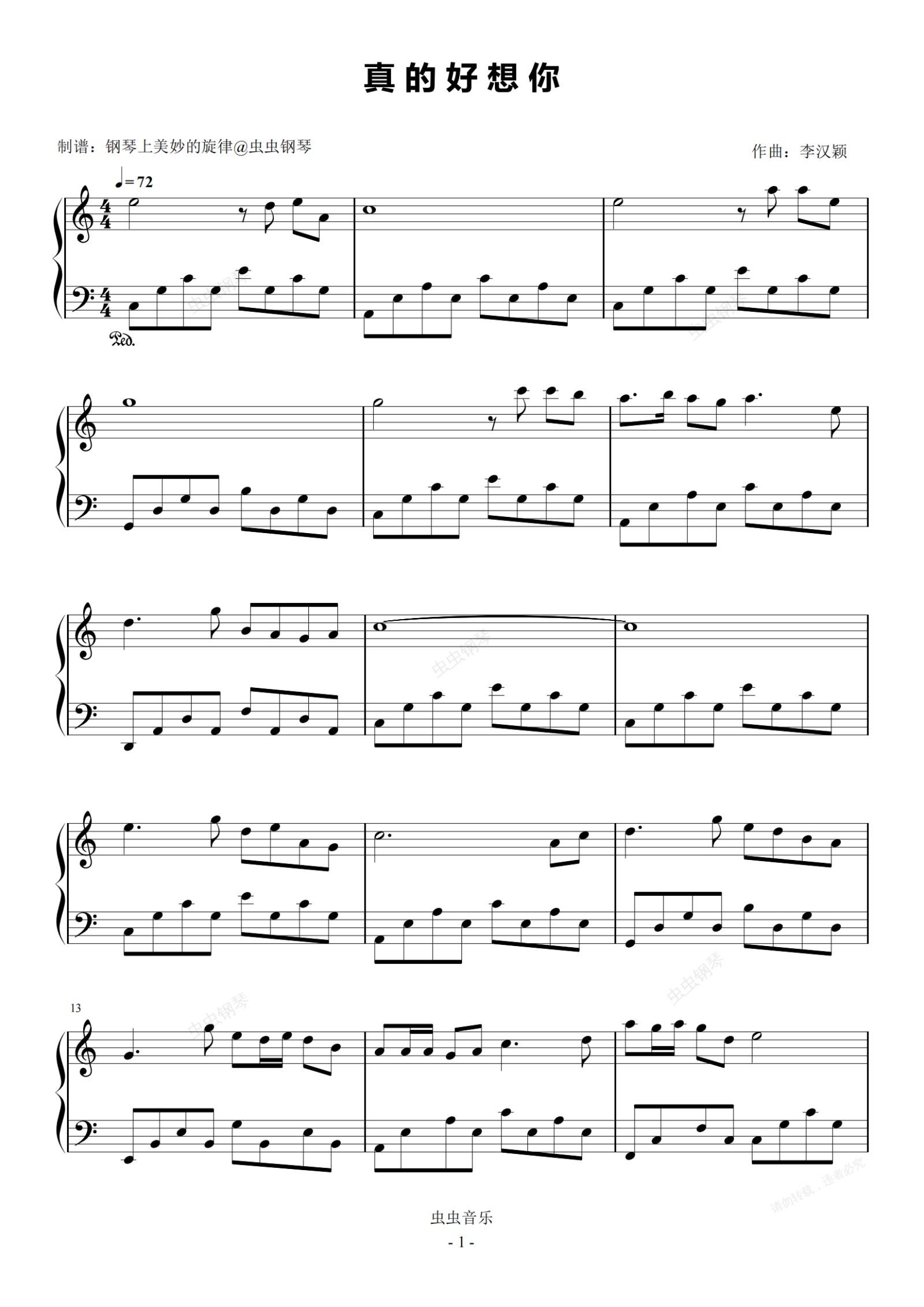 钢琴谱:真的好想你  C调简易版 周冰倩  流行经典