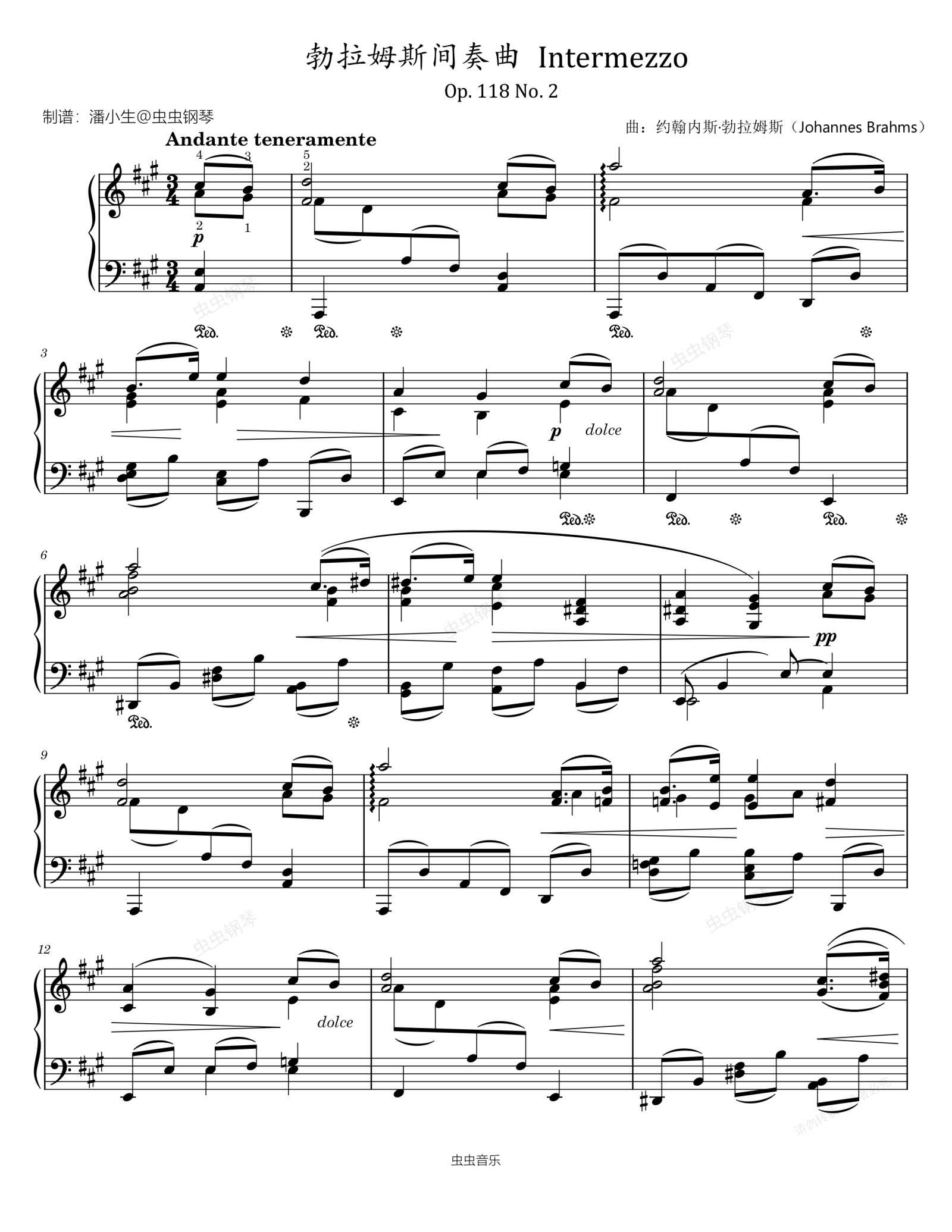 钢琴谱:勃拉姆斯 间奏曲  Intermezzo Op. 118 No. 2 (A Major) 原版带指法