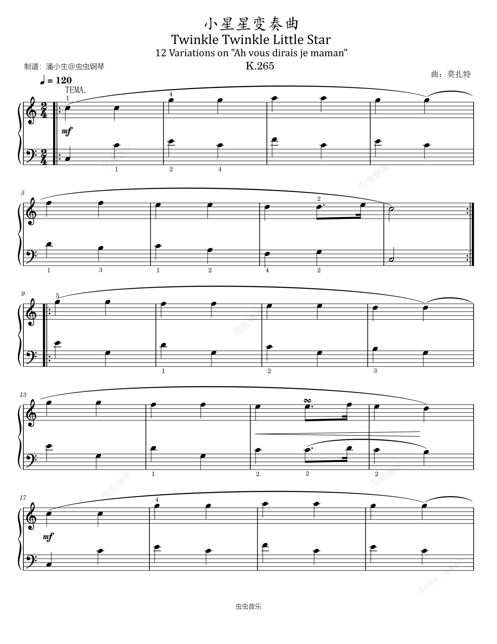 钢琴谱:莫扎特《小星星变奏曲》原版带指法 Twinkle Twinkle Little Star 12 Variations K.265