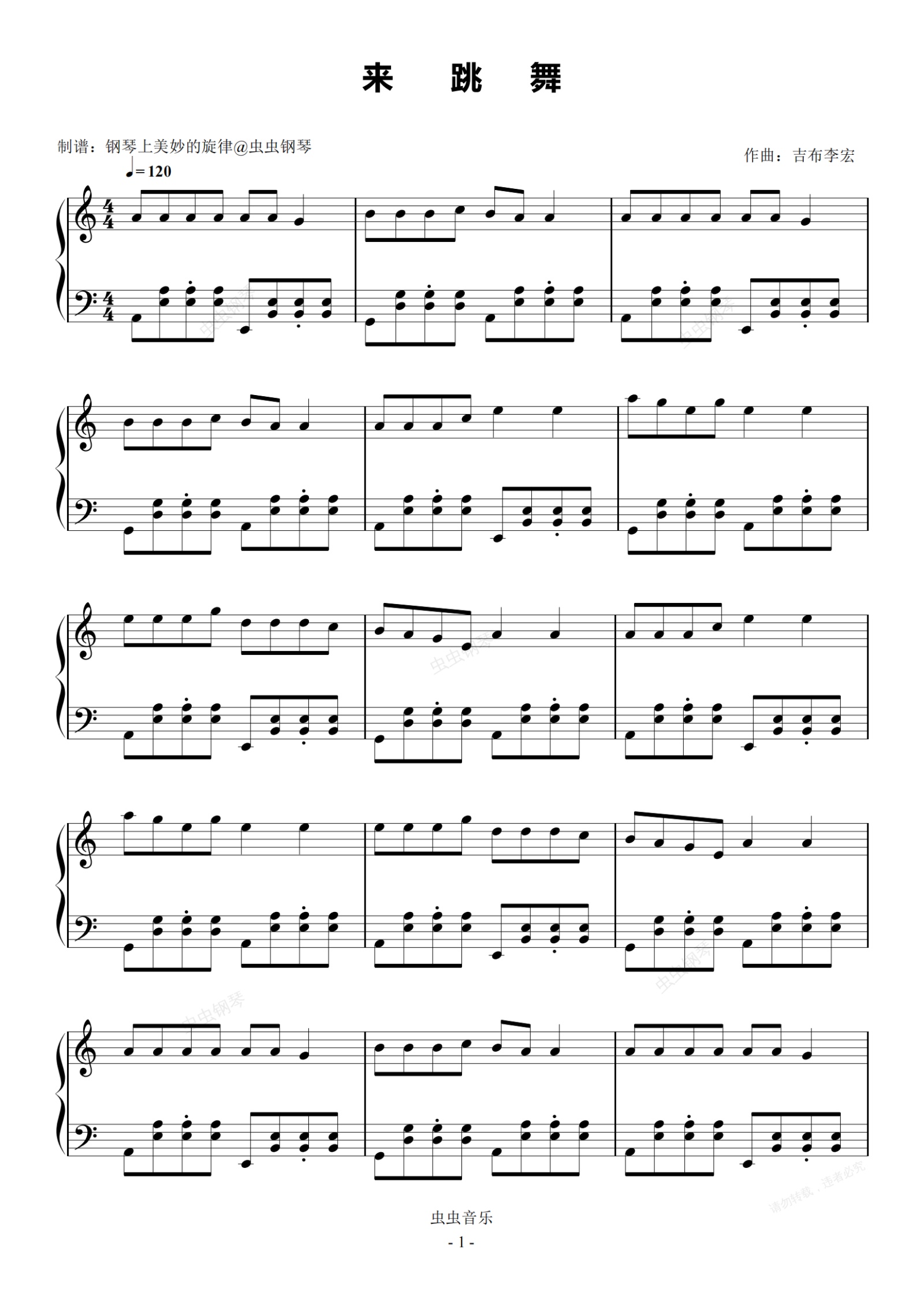 钢琴谱:来跳舞  C调简易版 海来阿木