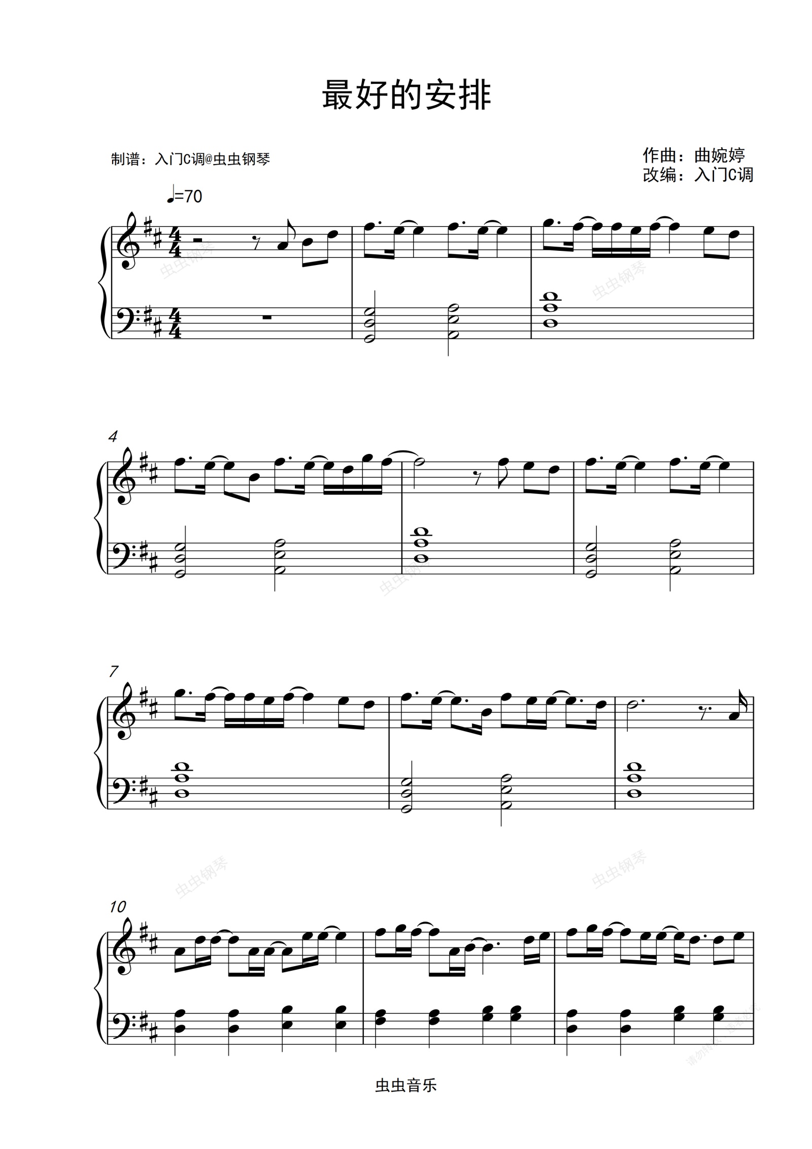 钢琴谱:曲婉婷《最好的安排》D调简单版