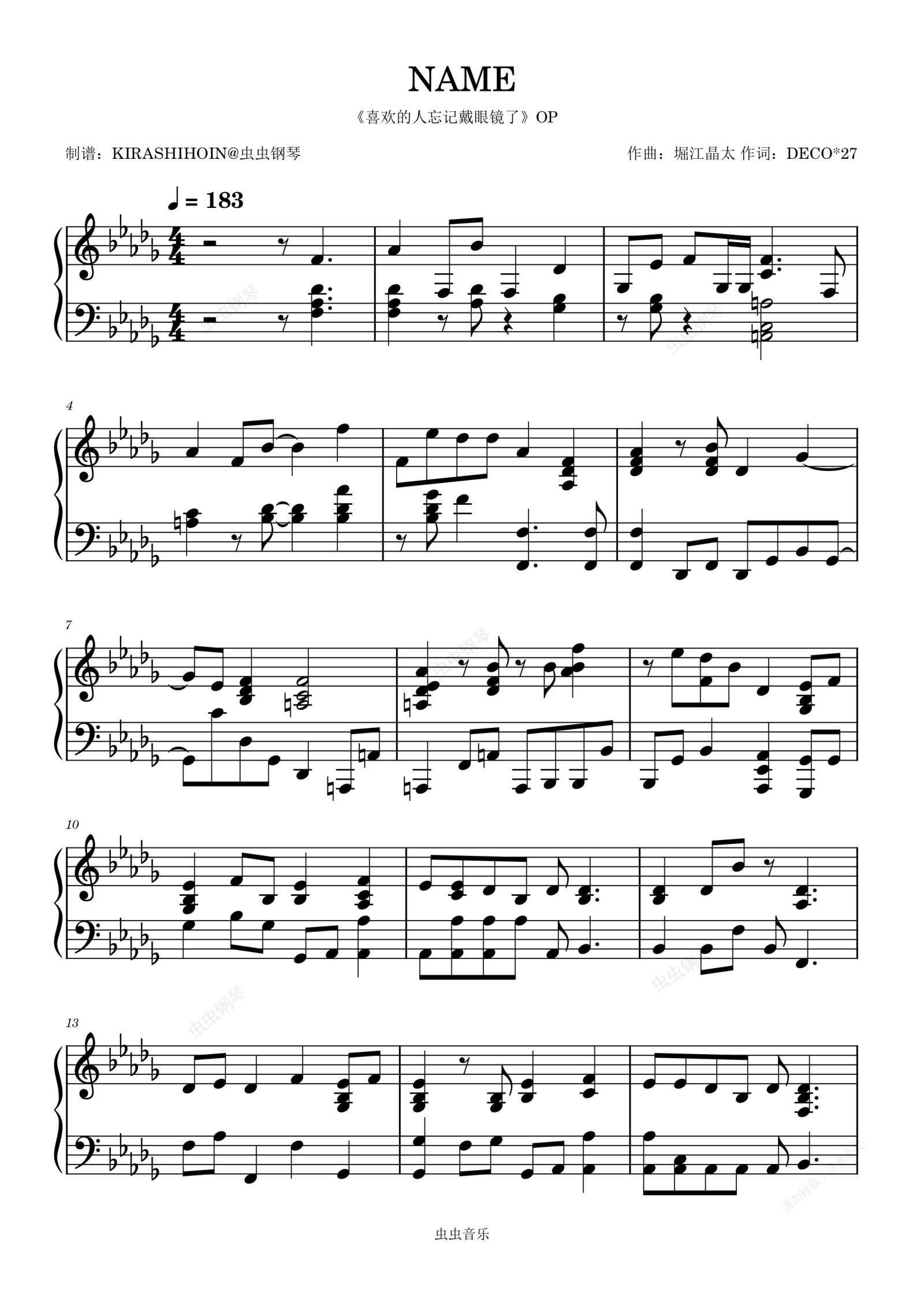 钢琴谱:NAME(《喜欢的人忘记戴眼镜了》OP/片头曲)- 綴