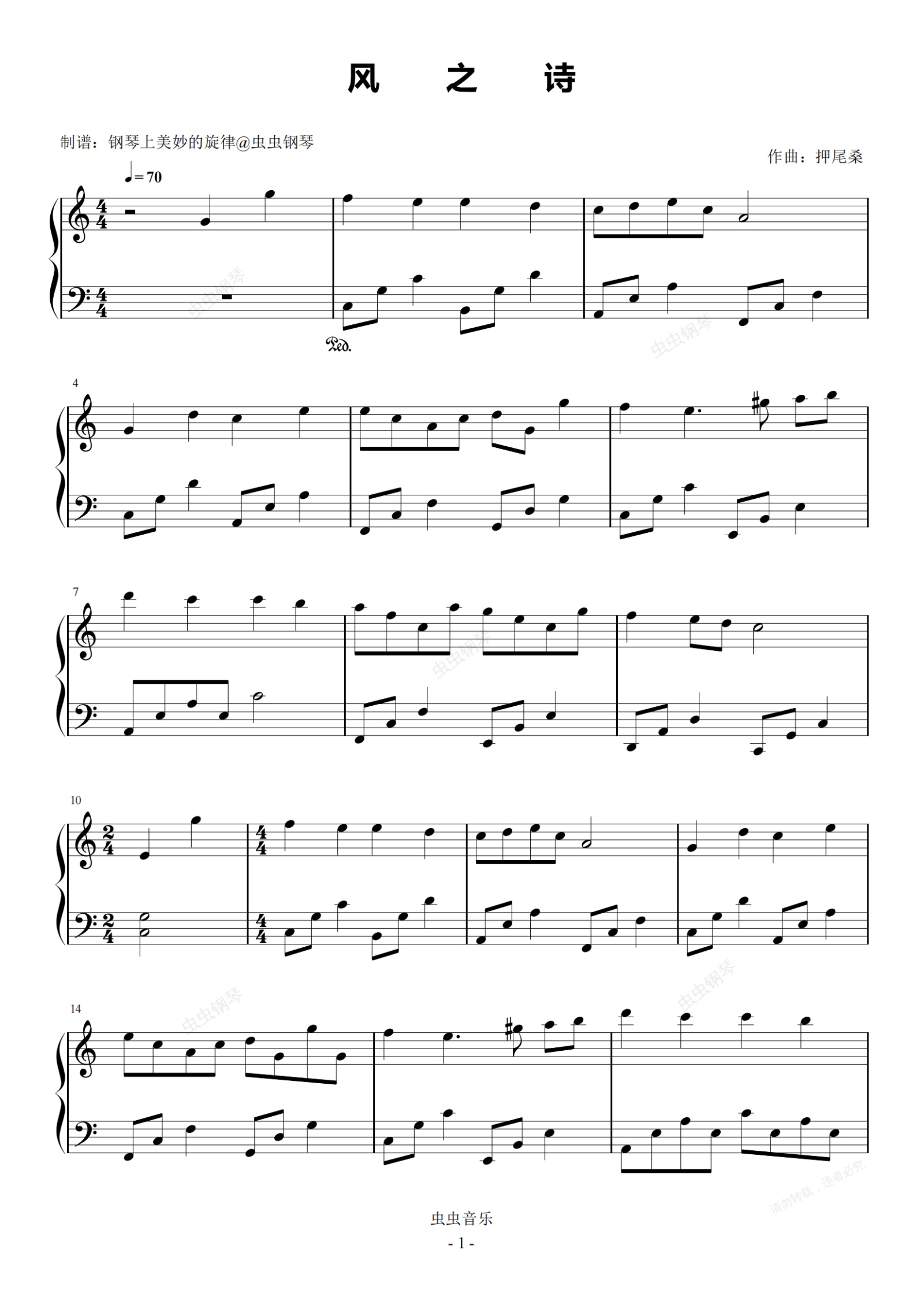 钢琴谱:风之诗 C调简易版 押尾桑 流行经典