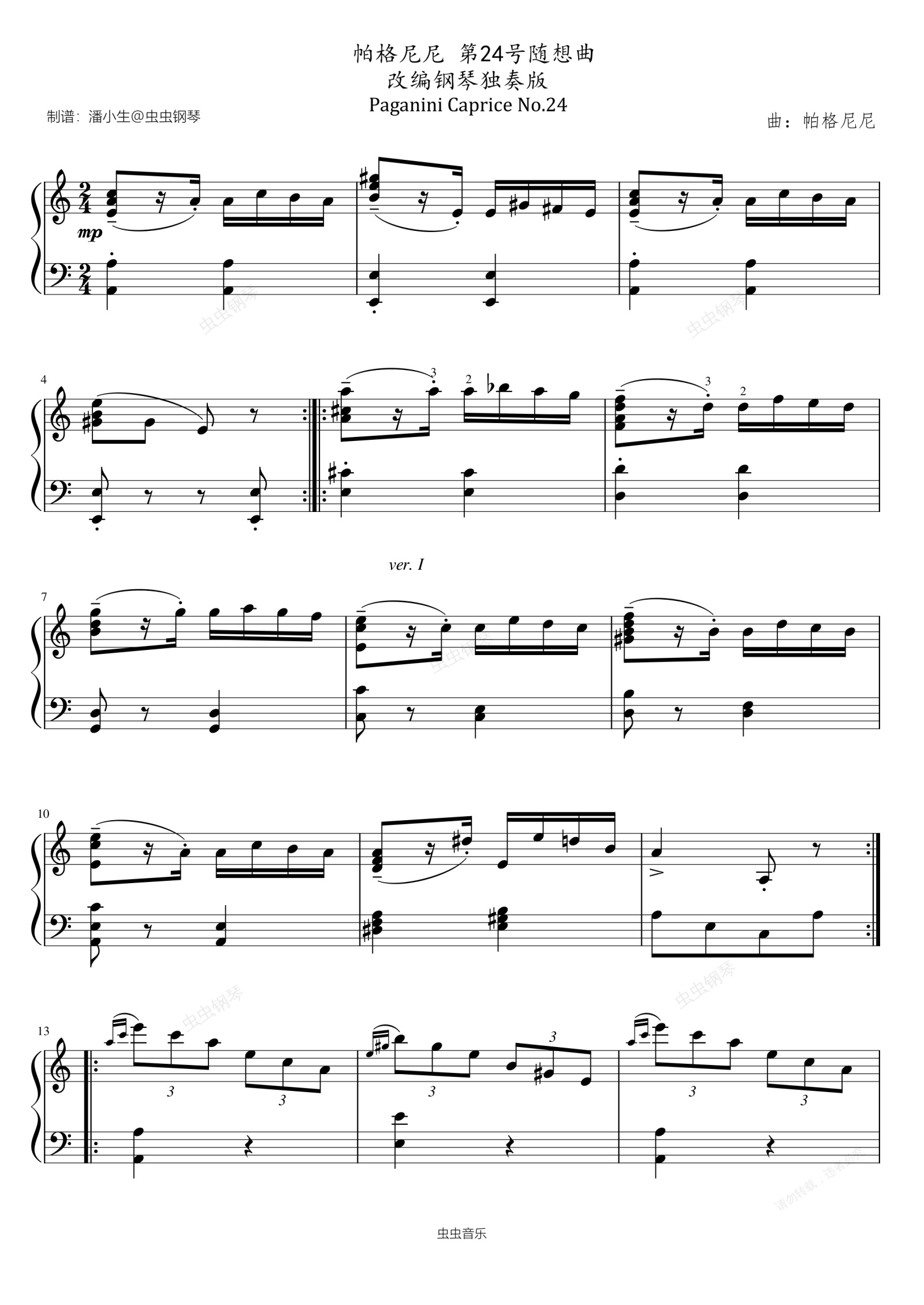 钢琴谱:帕格尼尼 第24号随想曲 改编钢琴独奏原版 带指法 Paganini Caprice No.24