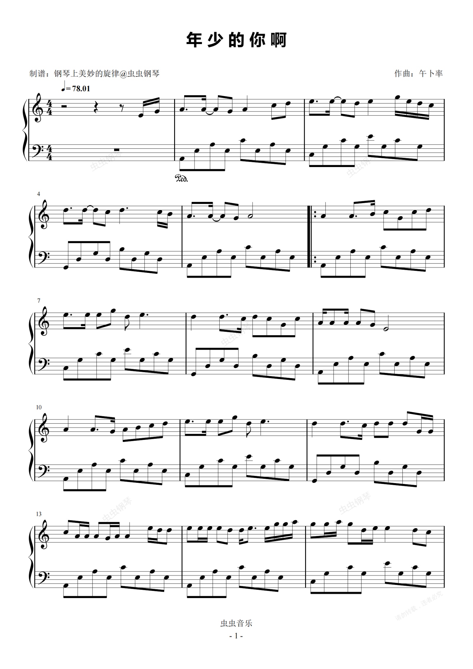 钢琴谱:年少的你啊 C调简易版 浩然H.R