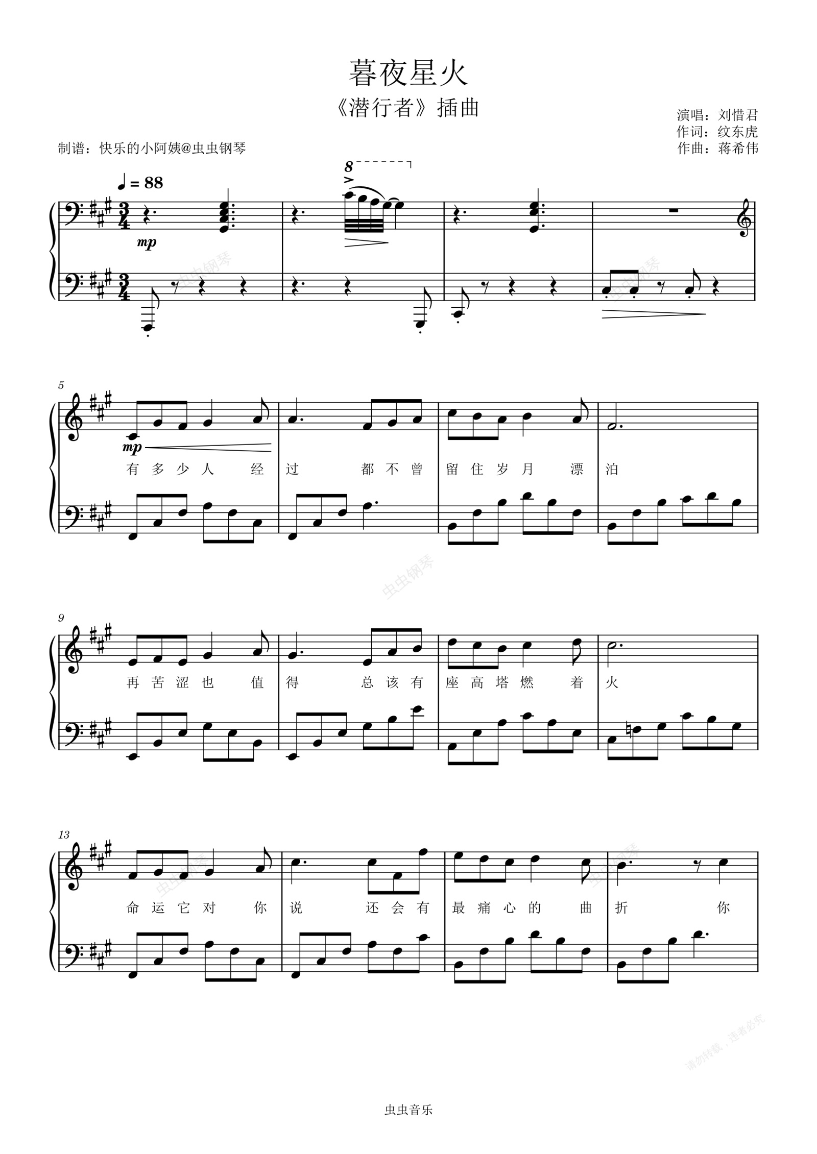 钢琴谱:暮夜星火(电视剧《潜行者》插曲)刘惜君