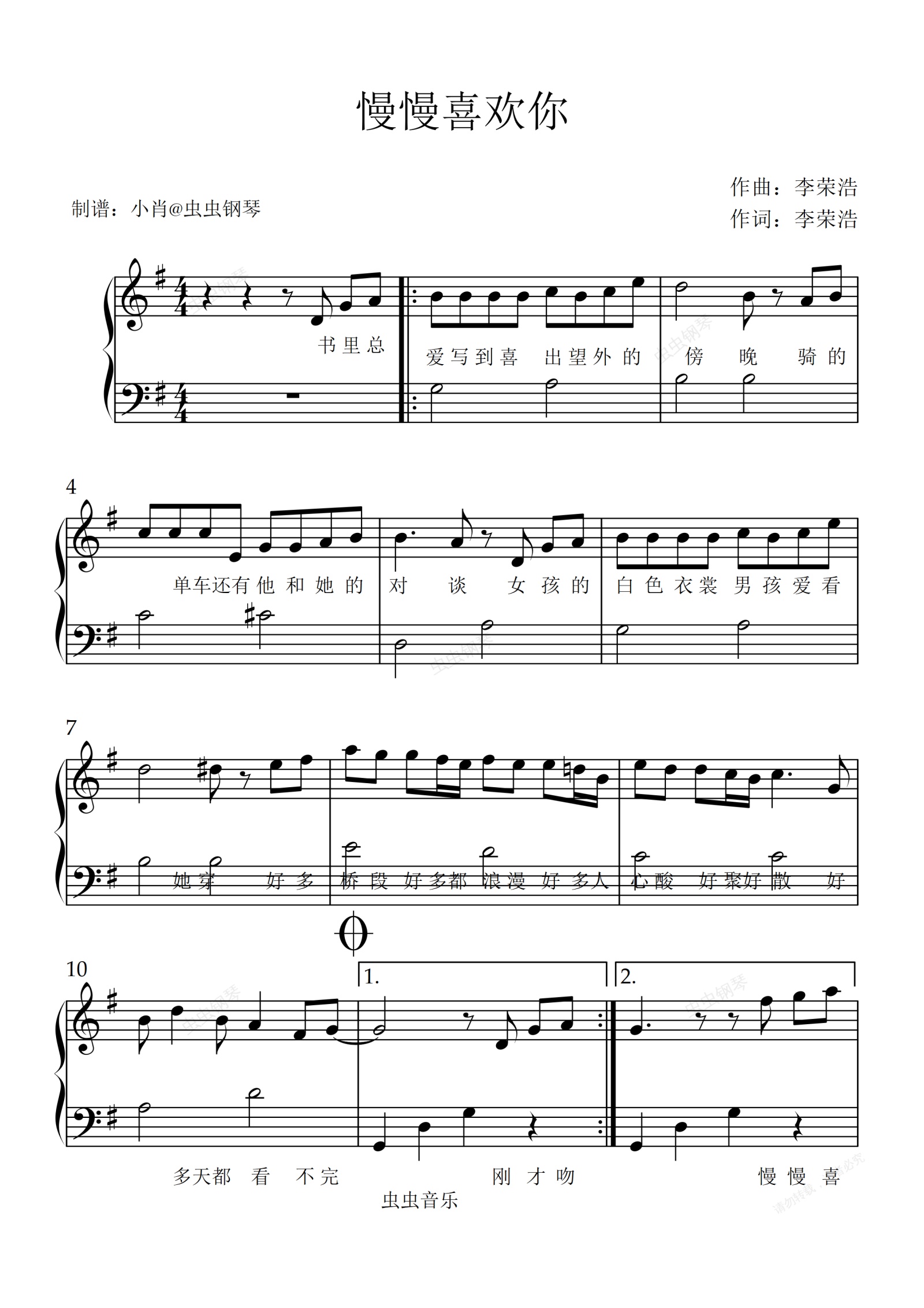 钢琴谱:大汤 拜厄程度带歌词 简易版 慢慢喜欢你