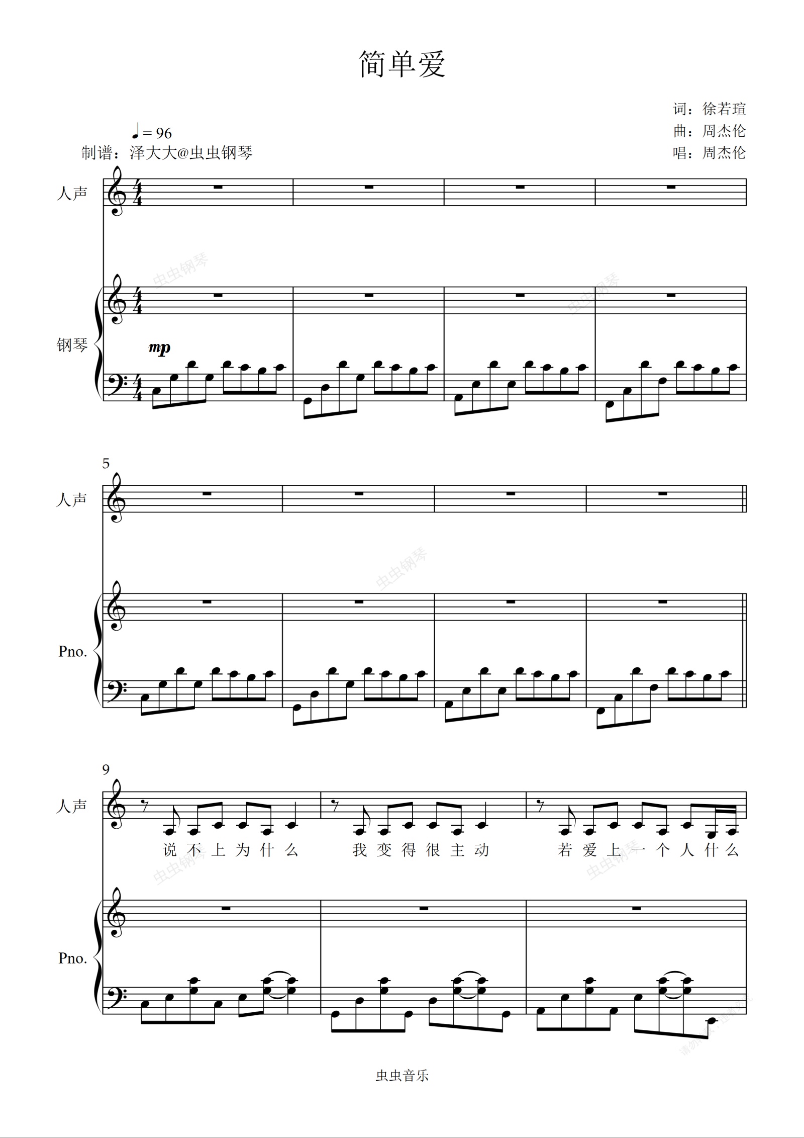 钢琴谱:简单爱【原版弹唱附词】泽大大 周杰伦