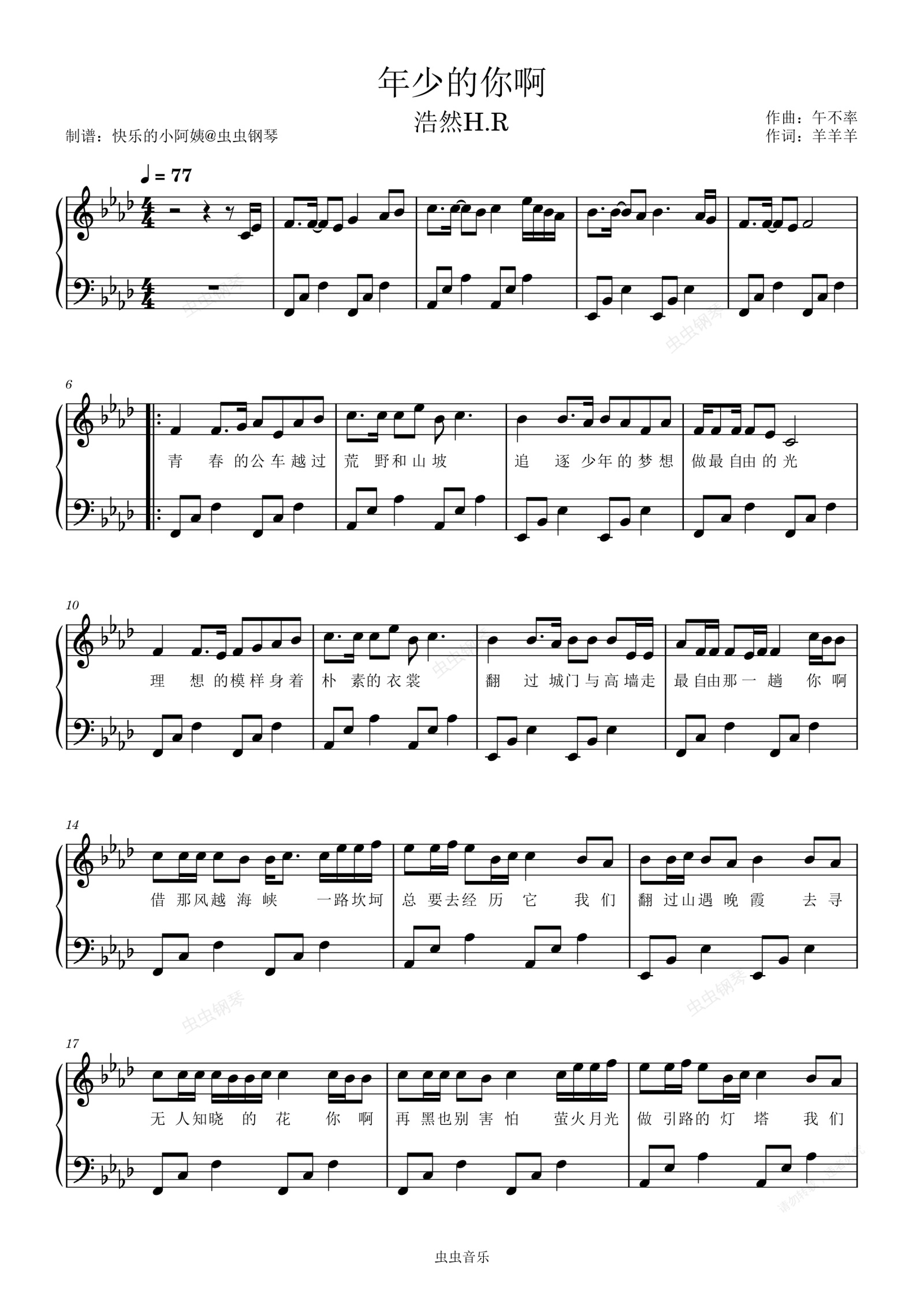钢琴谱:年少的你啊-浩然H.R-简易版带歌词