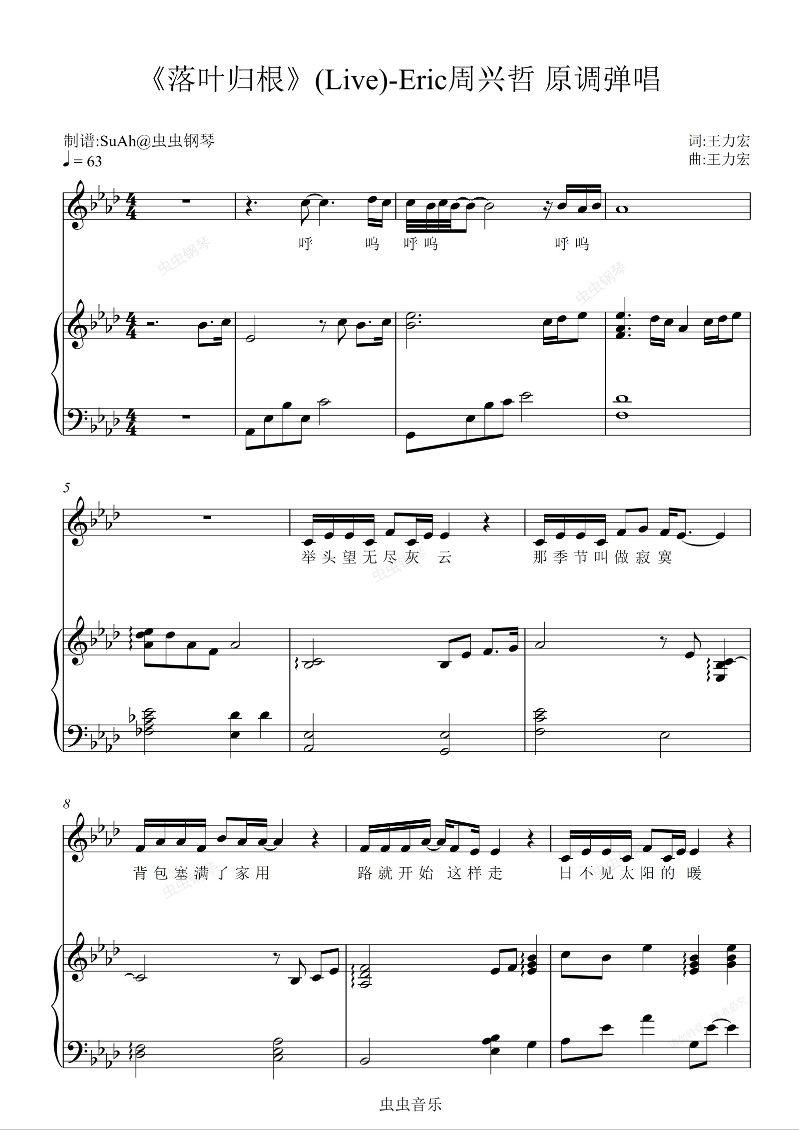 钢琴谱:落叶归根-王力宏(Eric周兴哲版本 中国梦之声 我们的歌(Live)) 原调 弹唱附词