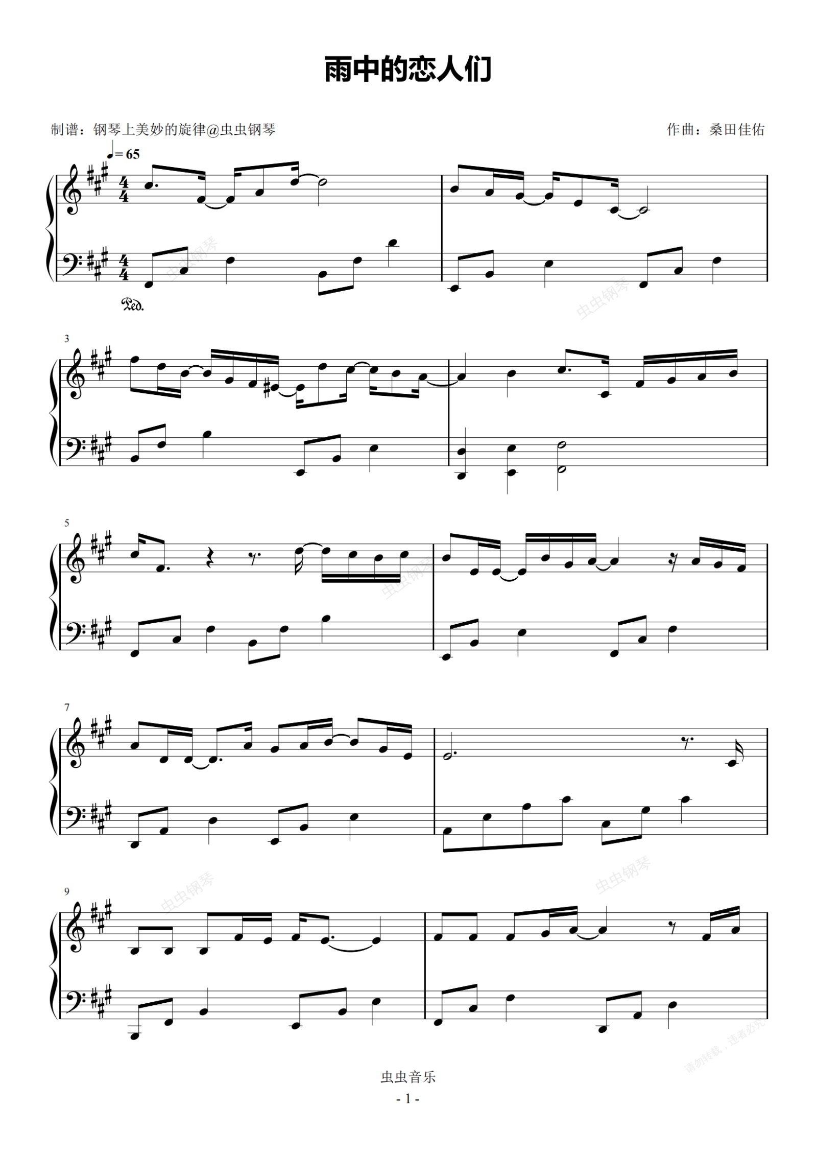 钢琴谱:雨中的恋人们 原调简易版 黄凯芹 经典流行
