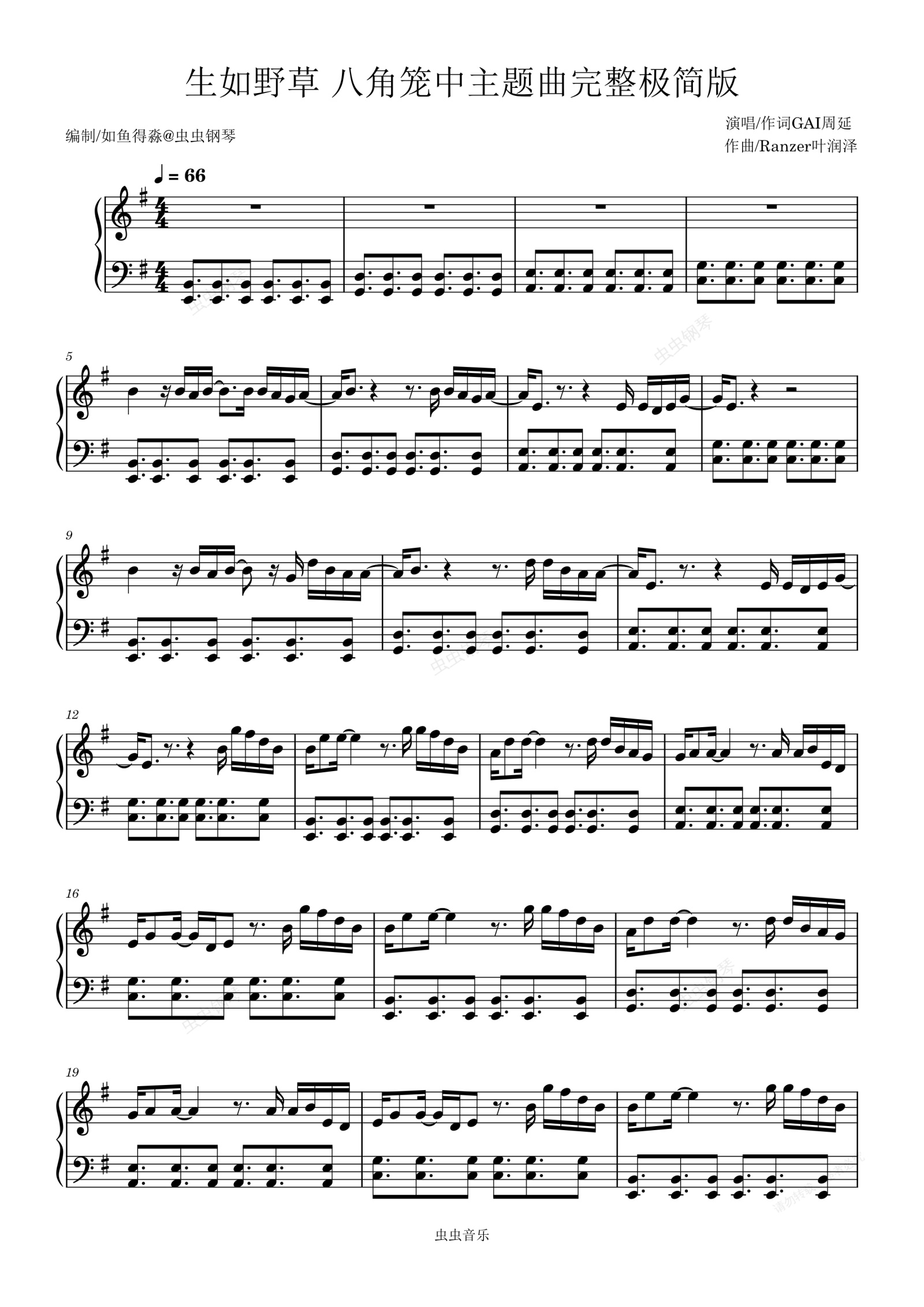 钢琴谱:生如野草 八角笼中主题曲完整极简版