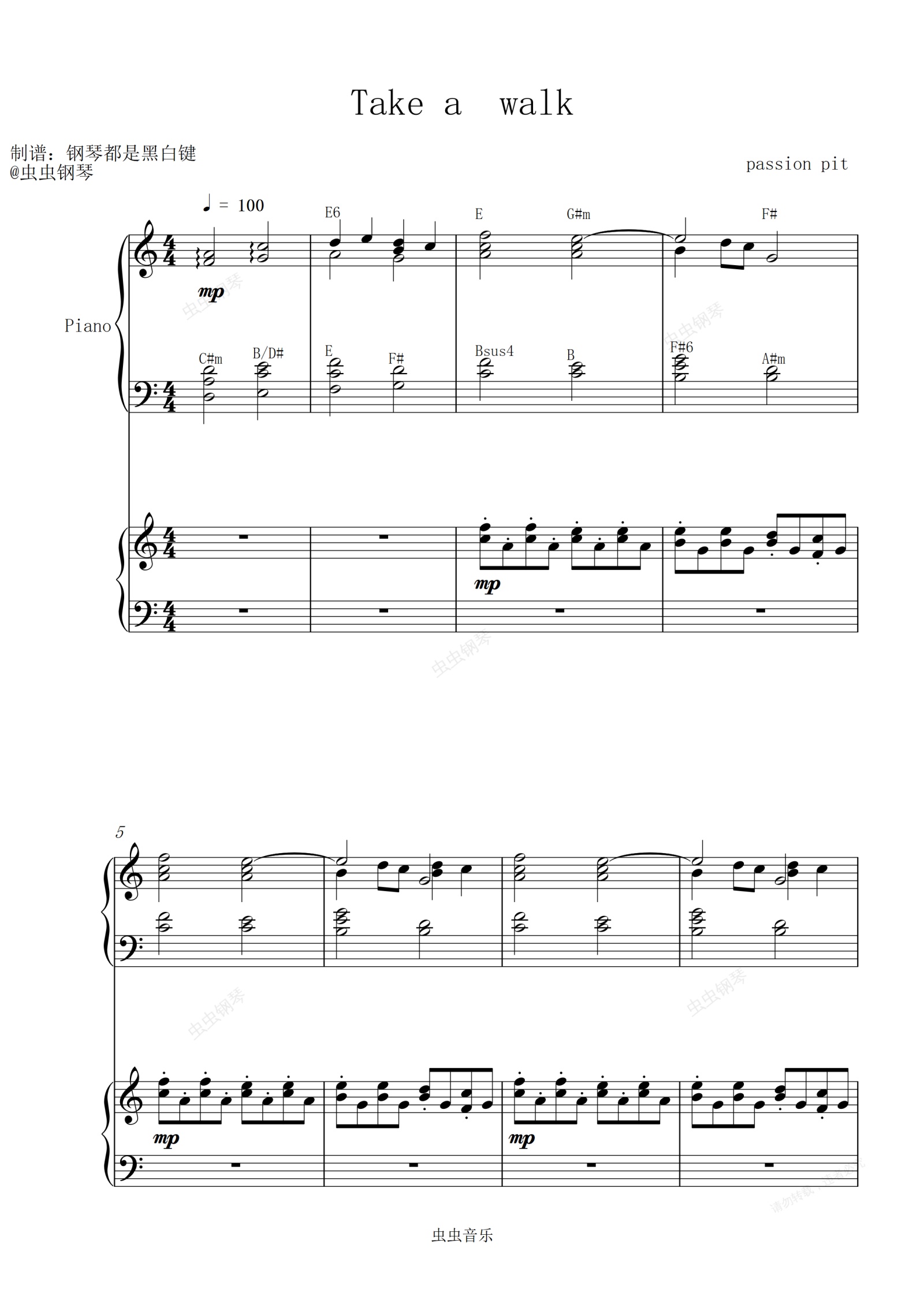 钢琴谱:Take a walk -Passion Pit 【四手连弹 】