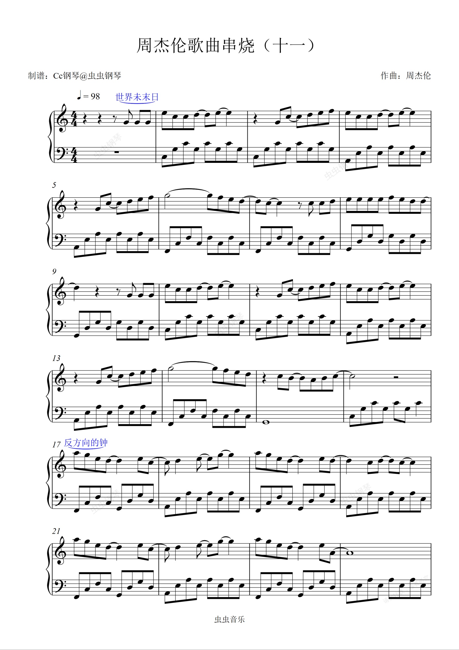 钢琴谱:周杰伦歌曲串烧(十一)C调 好听易上手