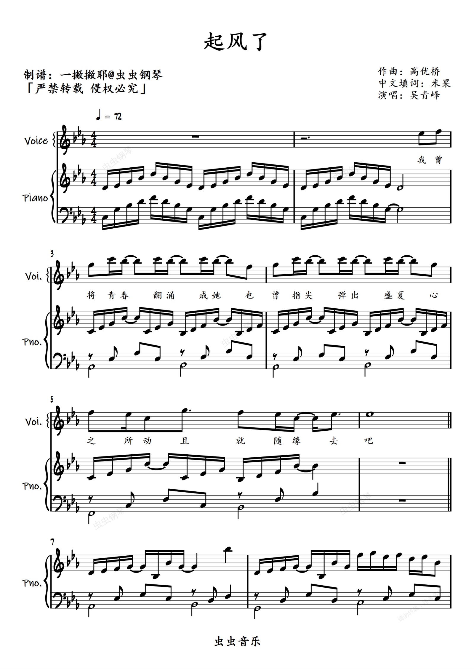 钢琴谱:弹唱谱《起风了》吴青峰「一撇撇耶」