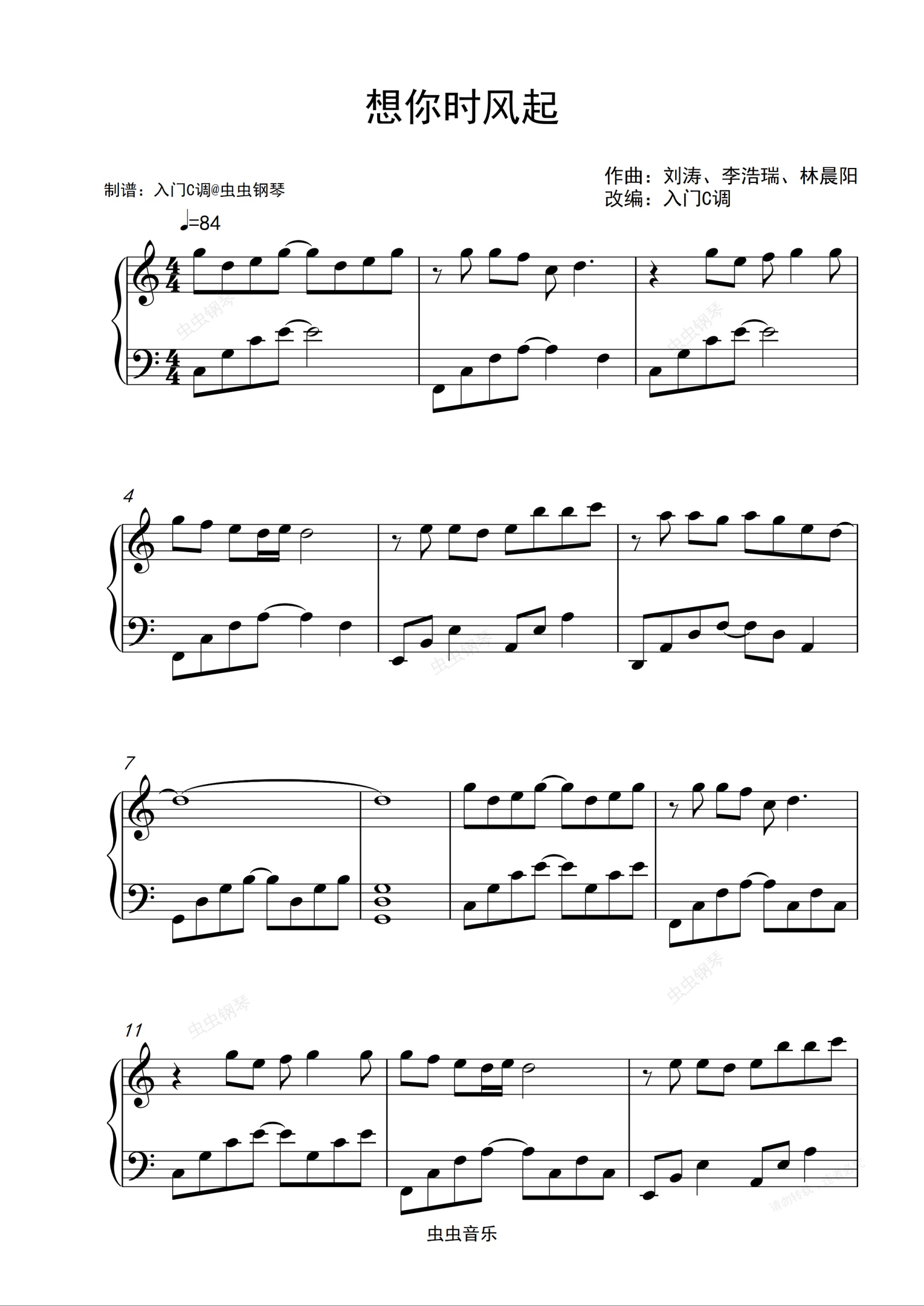 钢琴谱:单依纯《想你时风起》(《我的人间烟火》回忆主题曲)入门C调简单版