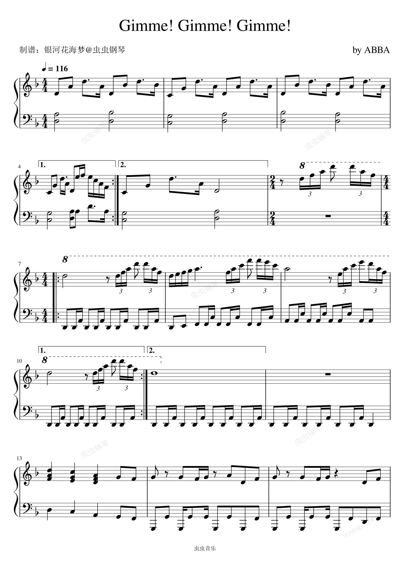 钢琴谱:ABBA - Gimme! Gimme! Gimme! 给我 给我 给我 F大调