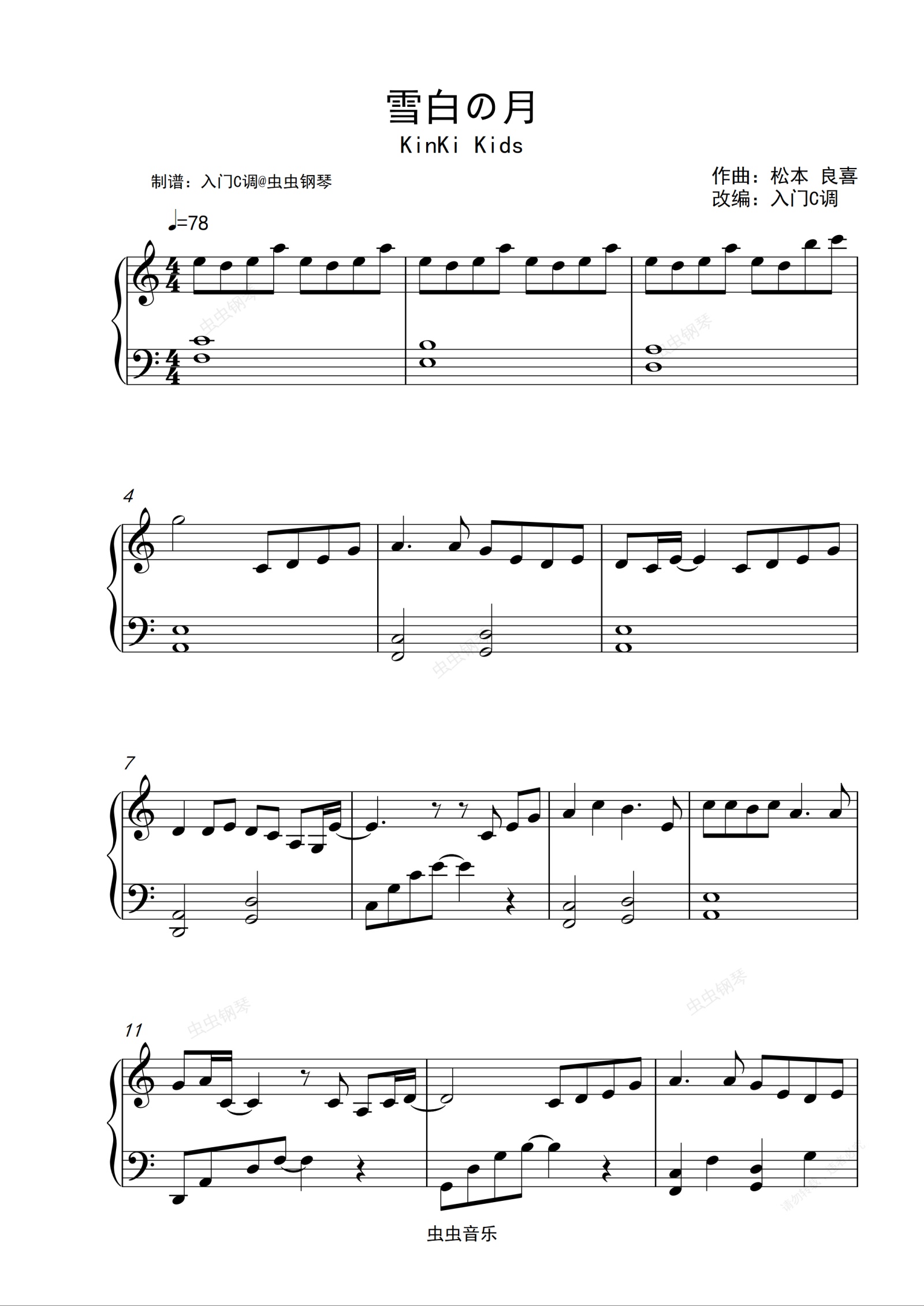 钢琴谱:KinKi Kids《雪白の月 (雪白之月)》入门C调简单版