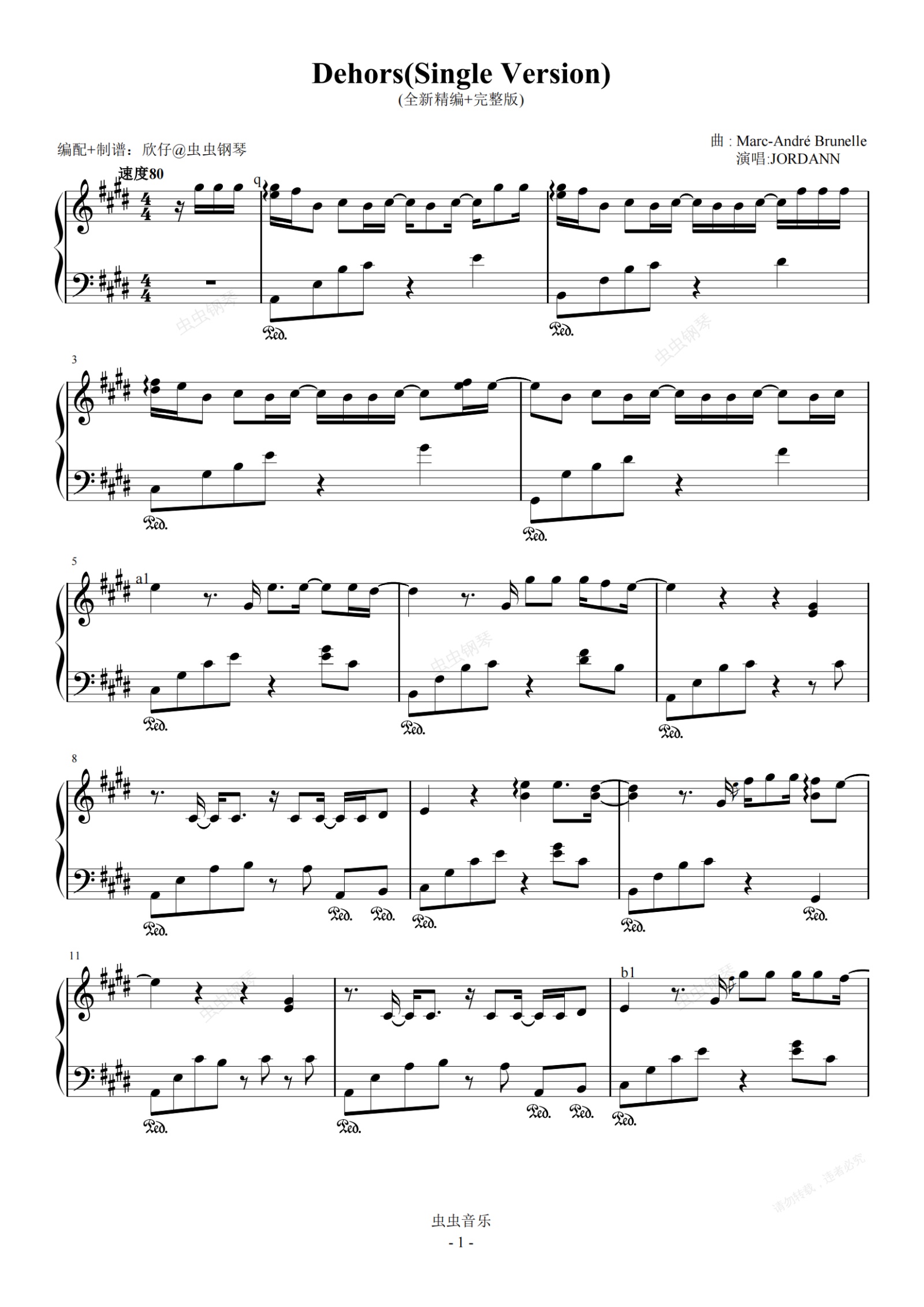 钢琴谱:Jordann-E《Dehors》(全新精编+完整版)