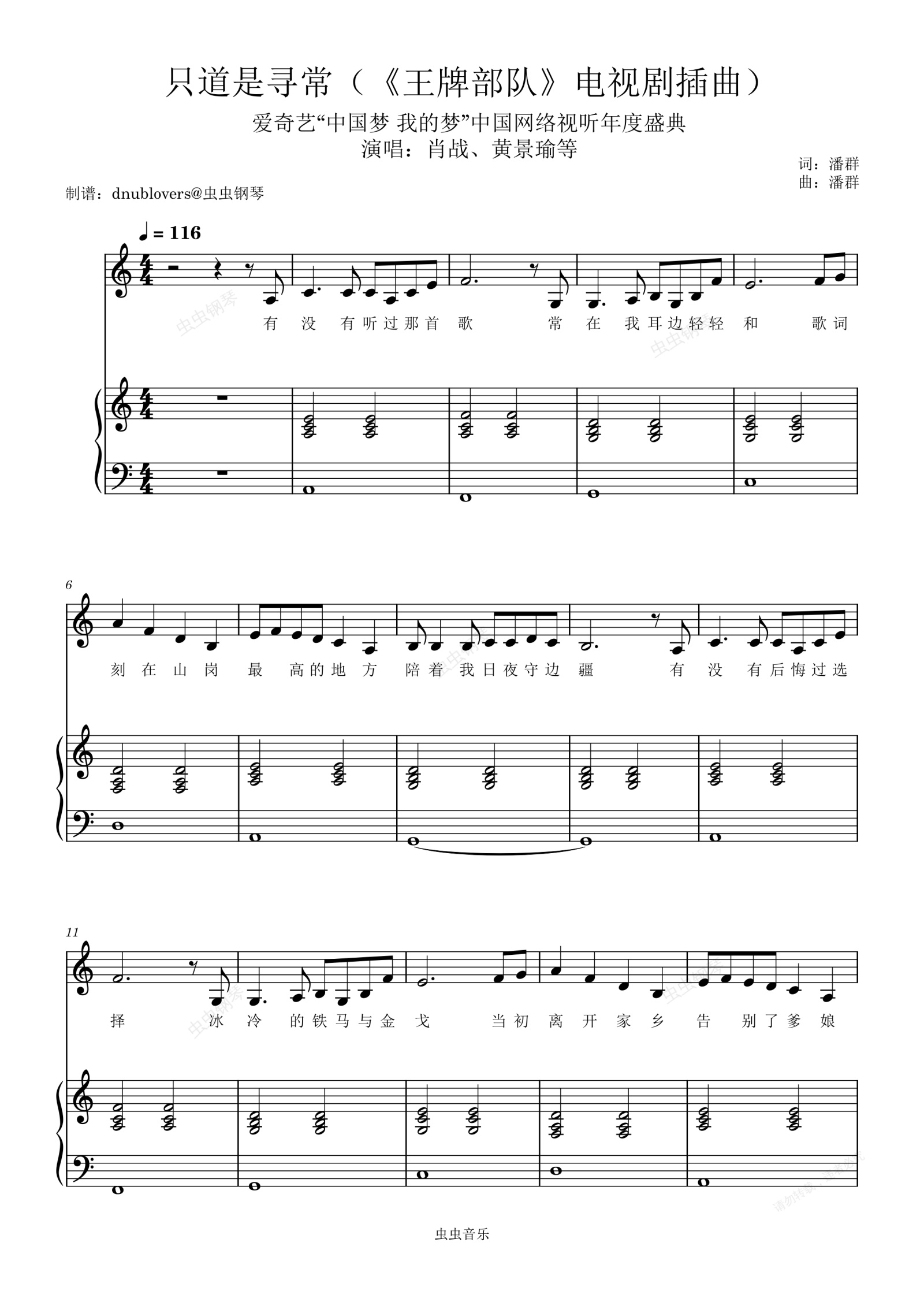 钢琴谱:只道是寻常-肖战黄景瑜C调简易弹唱谱带歌词