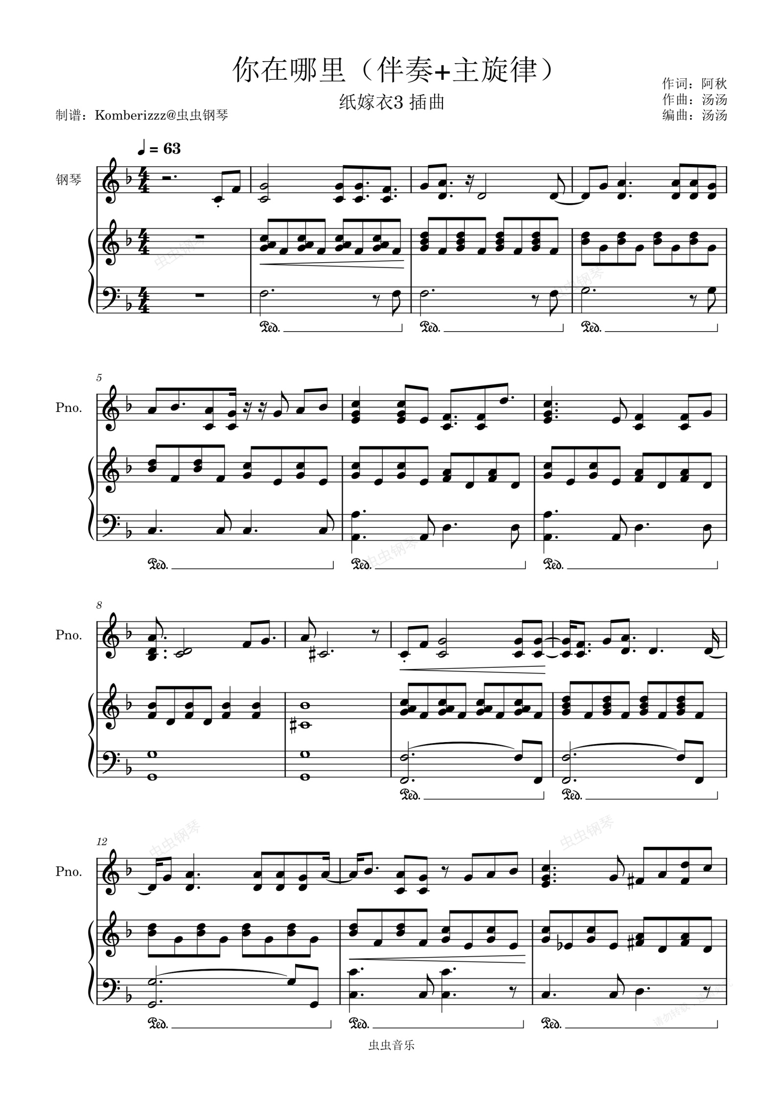 钢琴谱:纸嫁衣3 插曲《你在哪里 伴奏+主旋律》 F大调