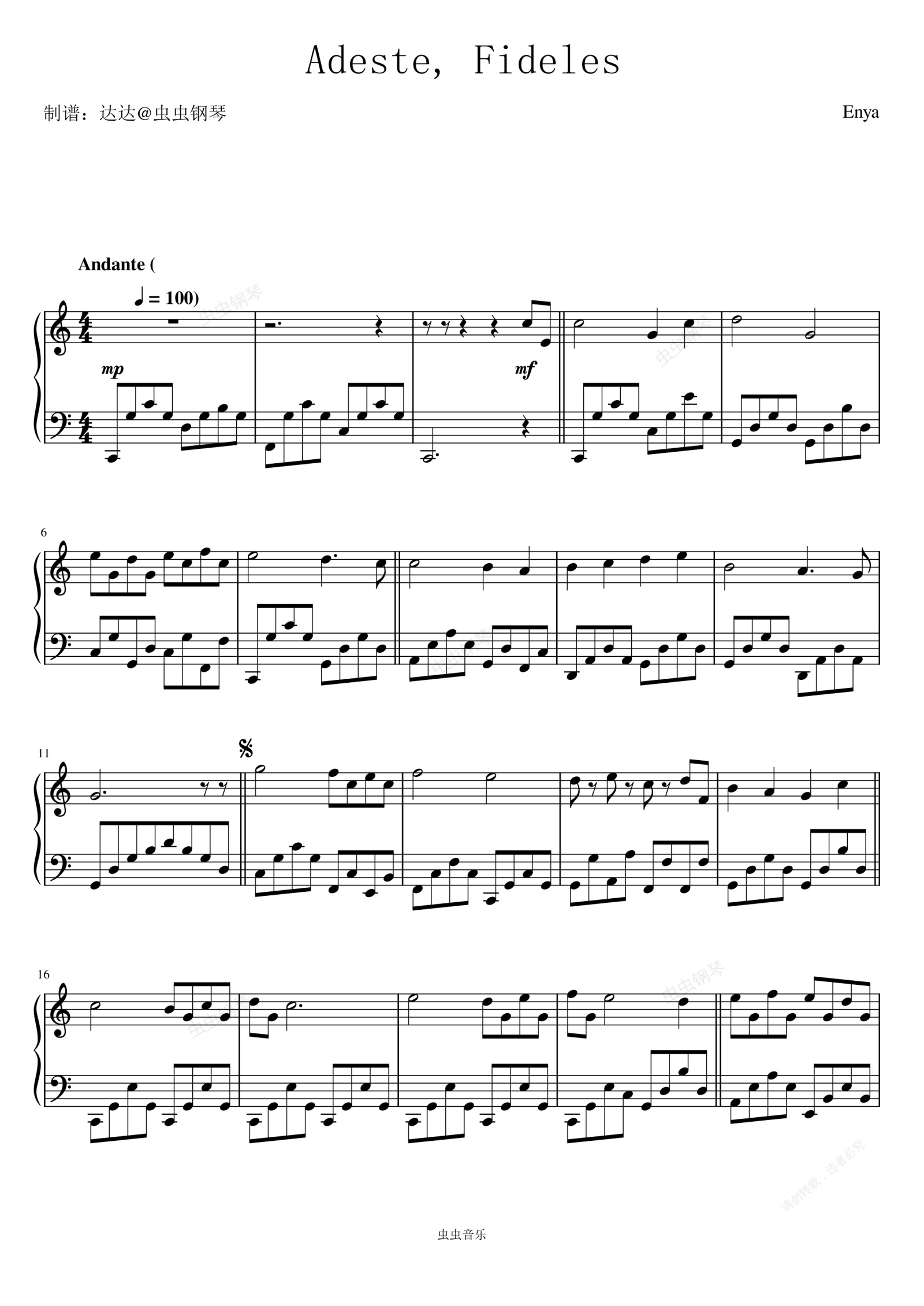 钢琴谱:Adeste, Fideles – Enya