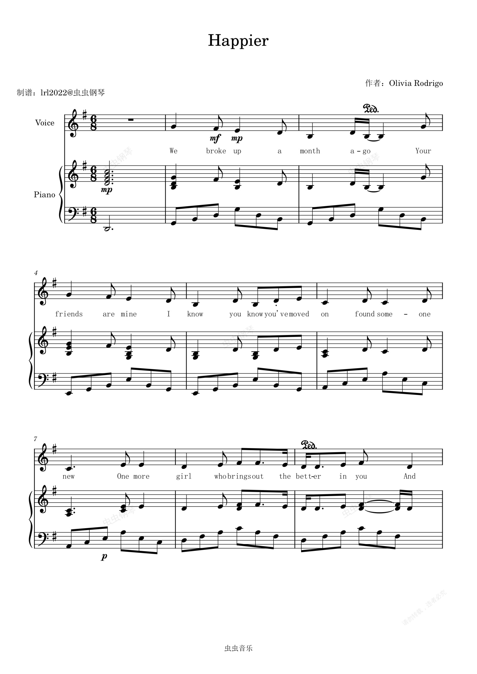 钢琴谱:happier - 钢琴伴奏弹唱谱+歌词 - Olivia Rodrigo