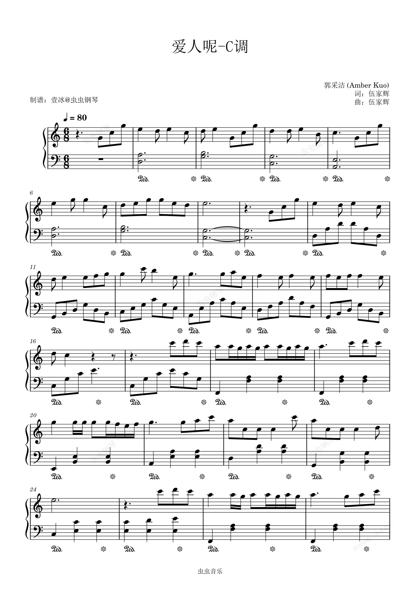 钢琴谱:爱人呢//郭采洁 (Amber Kuo) - C调 简单易上手