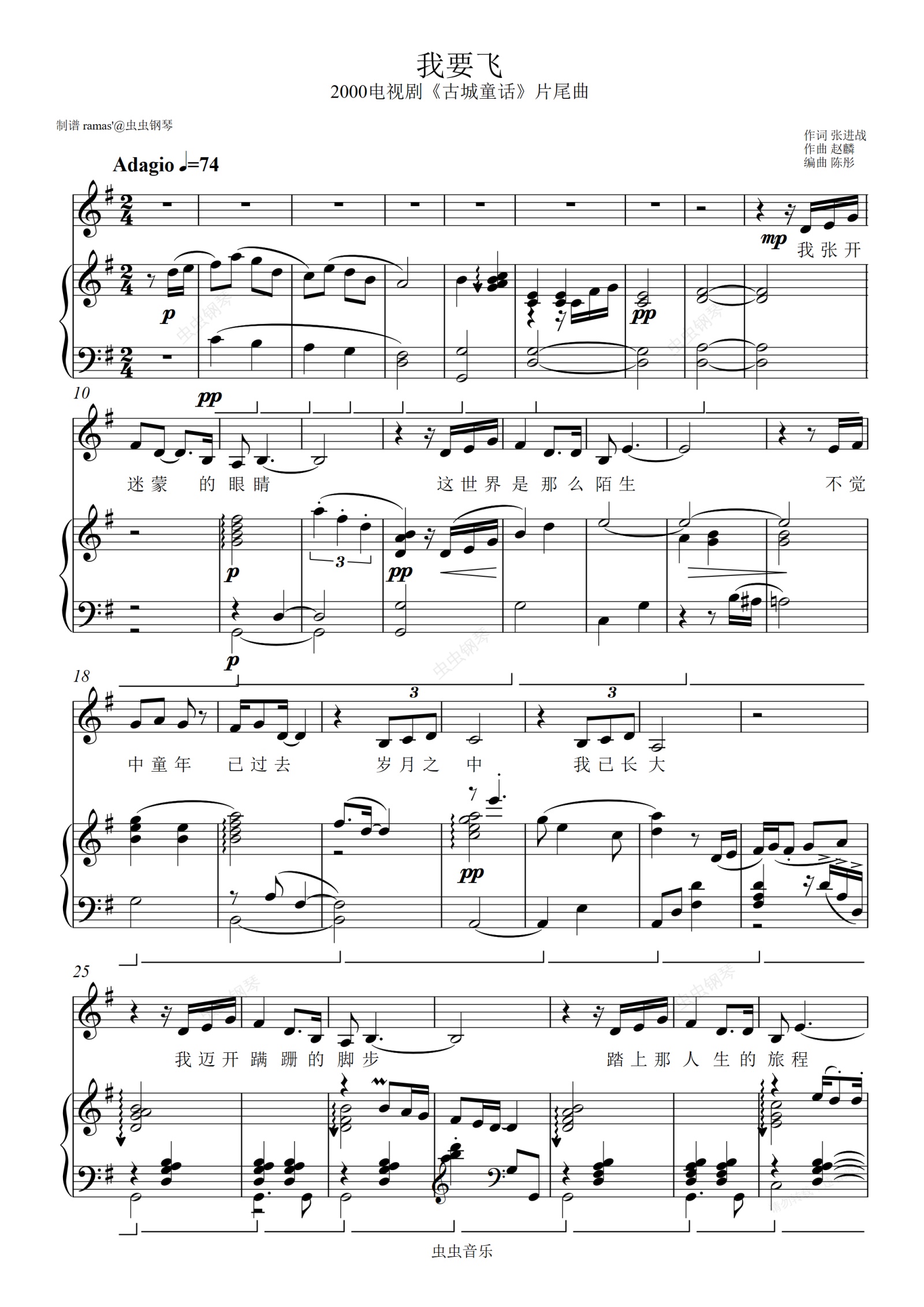 钢琴谱:“我要飞”——2000年电视剧《古城童话》主题曲(G调)