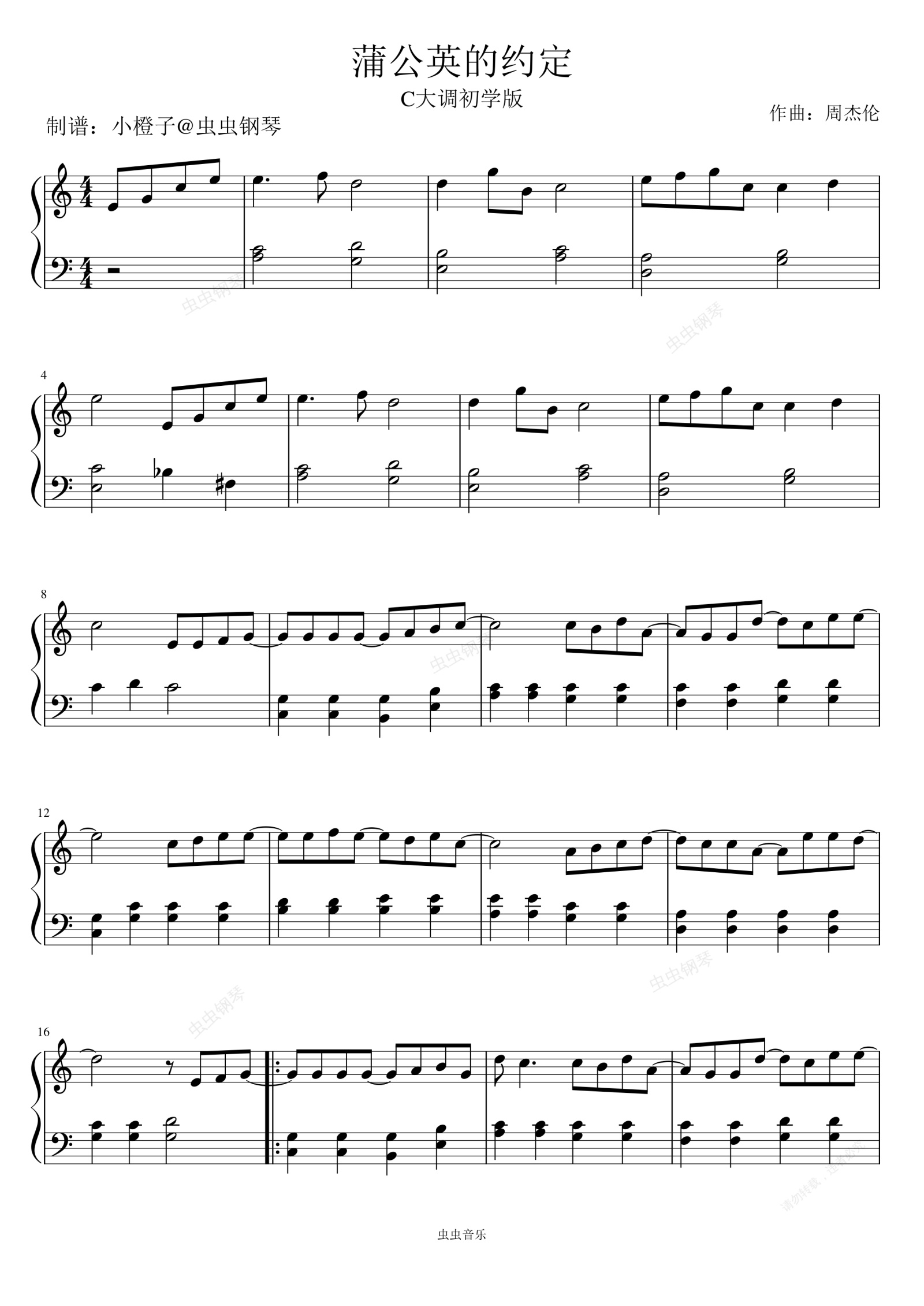 钢琴谱:⟪蒲公英的约定⟫C调简单版+拜厄难度