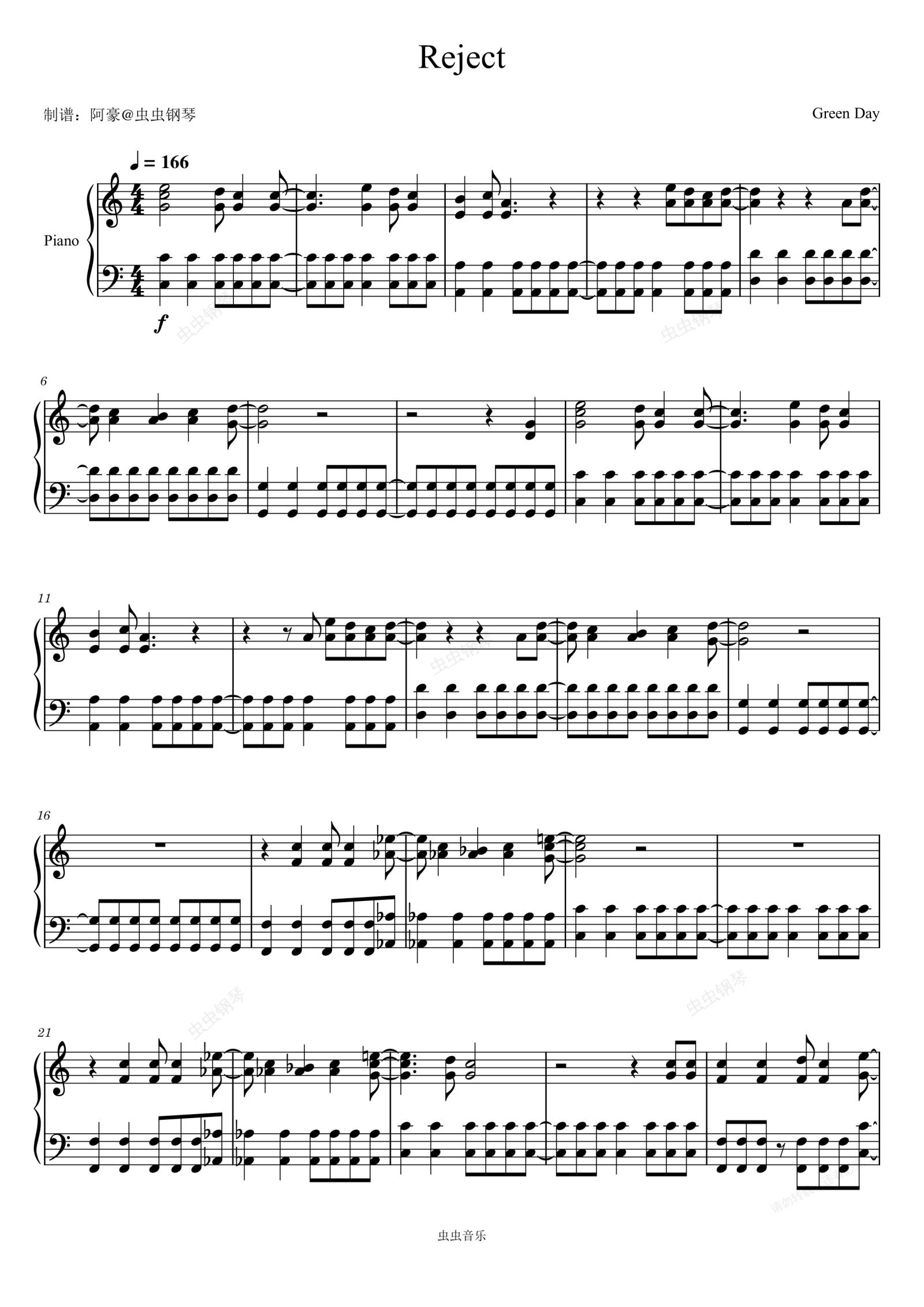 钢琴谱:Reject - Green Day