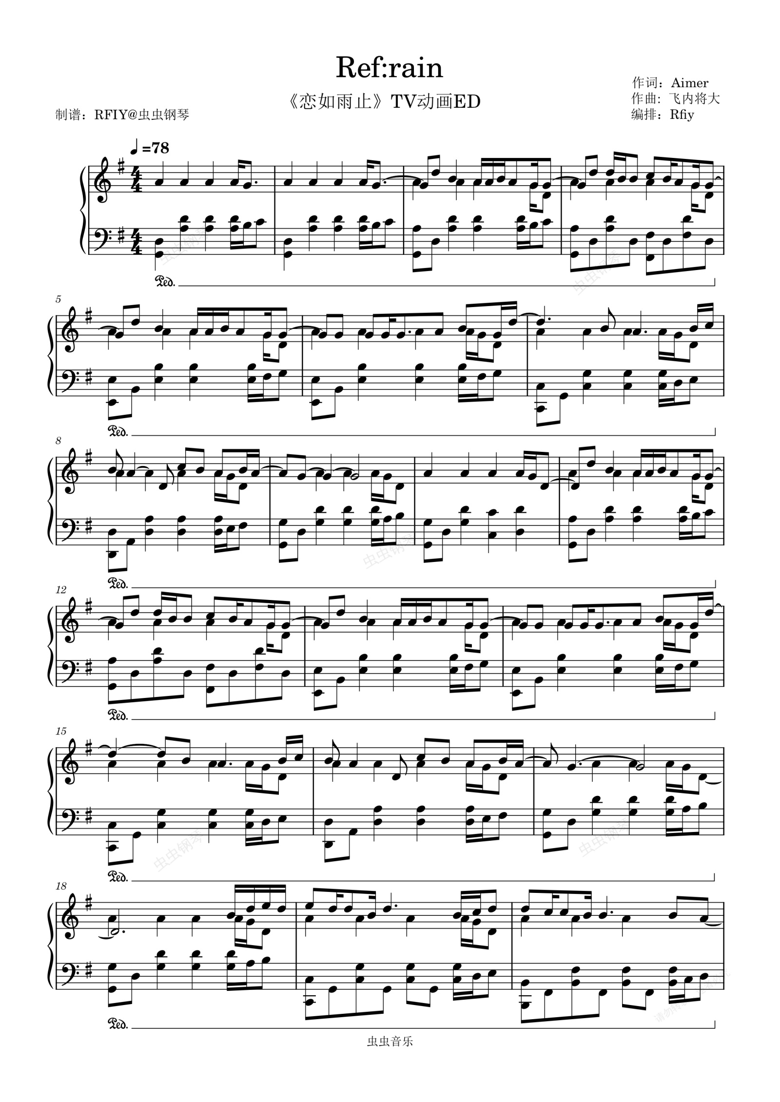 钢琴谱:Ref:rain TV动画《恋如雨止》ED