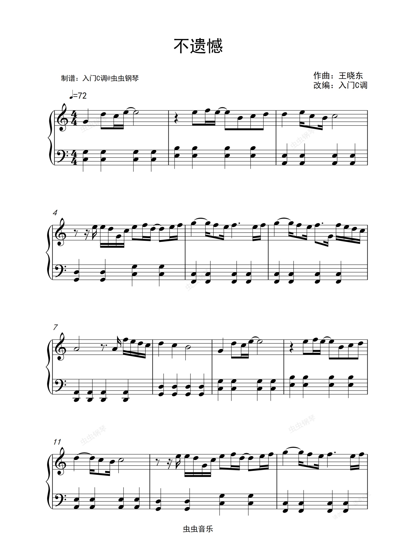 钢琴谱:李荣浩《不遗憾》(电影《你的婚礼》的主题曲)入门C调简单版