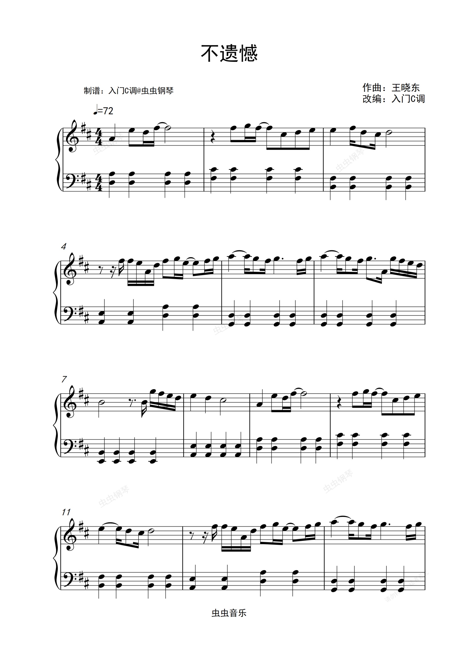 钢琴谱:李荣浩《不遗憾》(电影《你的婚礼》的主题曲)D调简单版