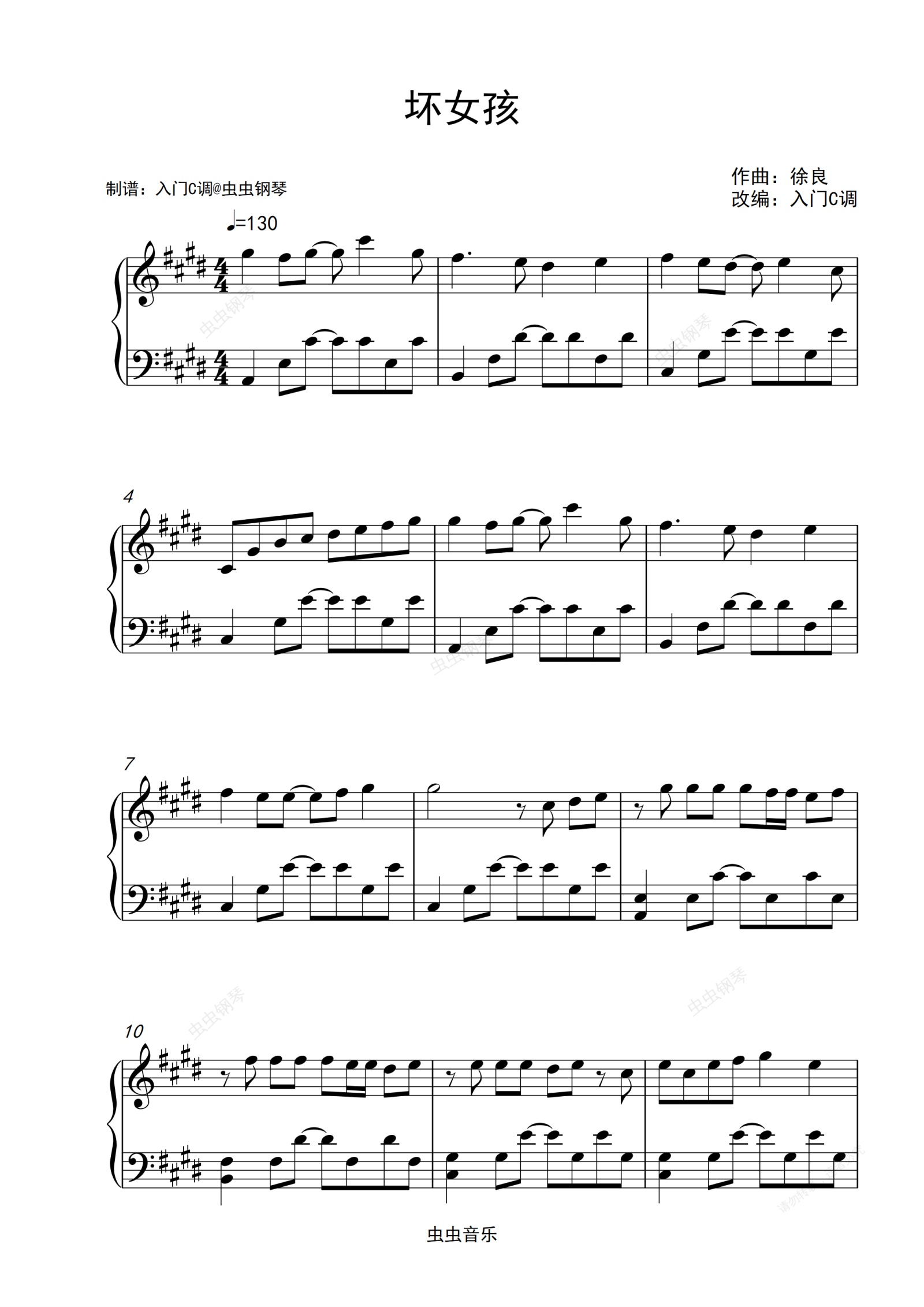 钢琴谱:【90后记忆】徐良《坏女孩》原调简单版