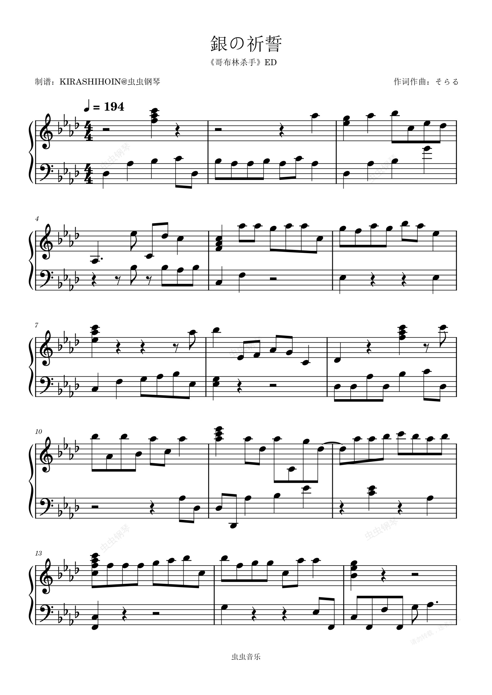 钢琴谱:銀の祈誓(《哥布林杀手》ED/片尾曲)- そらる