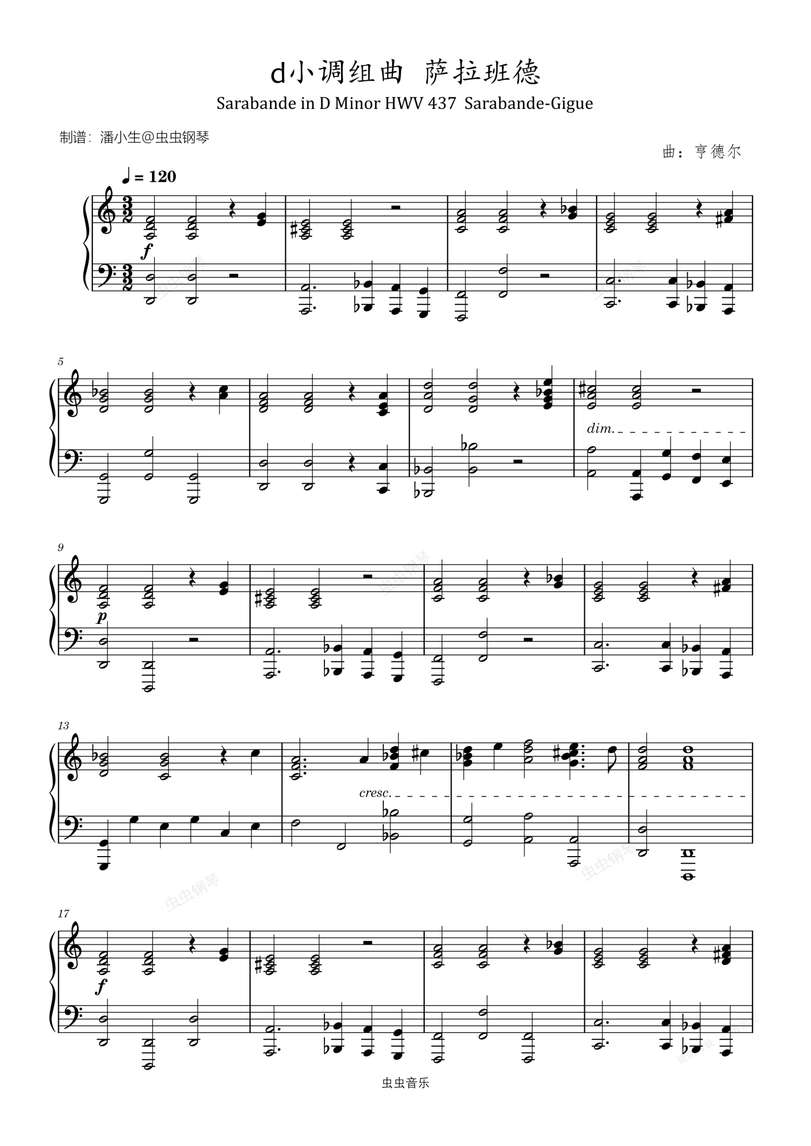 钢琴谱:亨德尔 d小调组曲 萨拉班德 Suite in D minor HWV 437 Srabande-Gigue