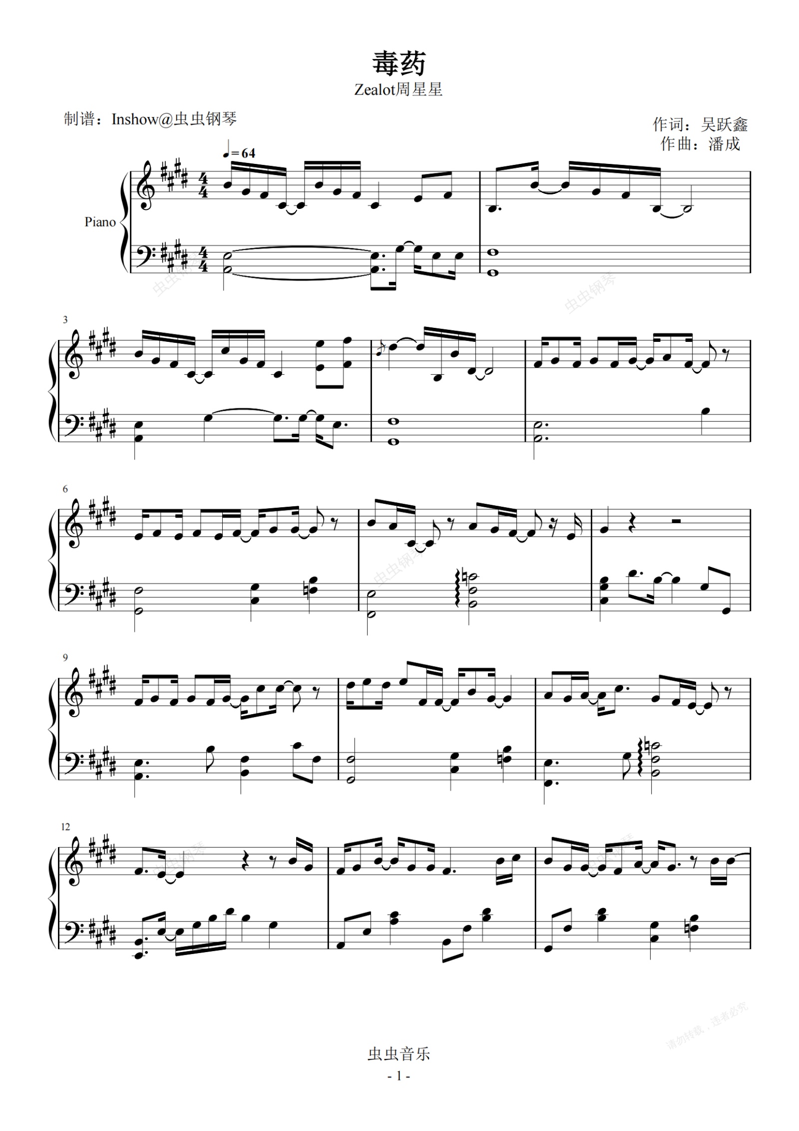 钢琴谱:毒药【完整独奏】- Zealot周星星 -