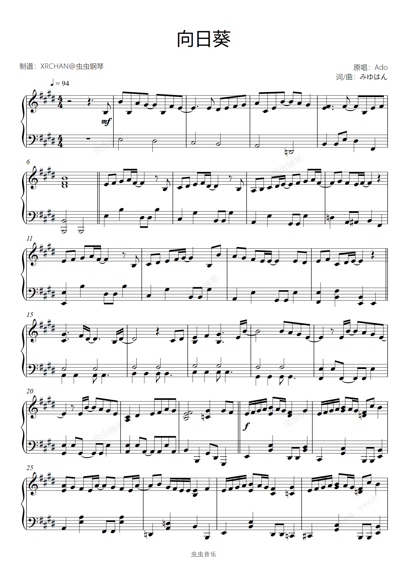 钢琴谱:「向日葵」《18/40~两个人的梦想与恋爱~》主题曲 Ado 初级