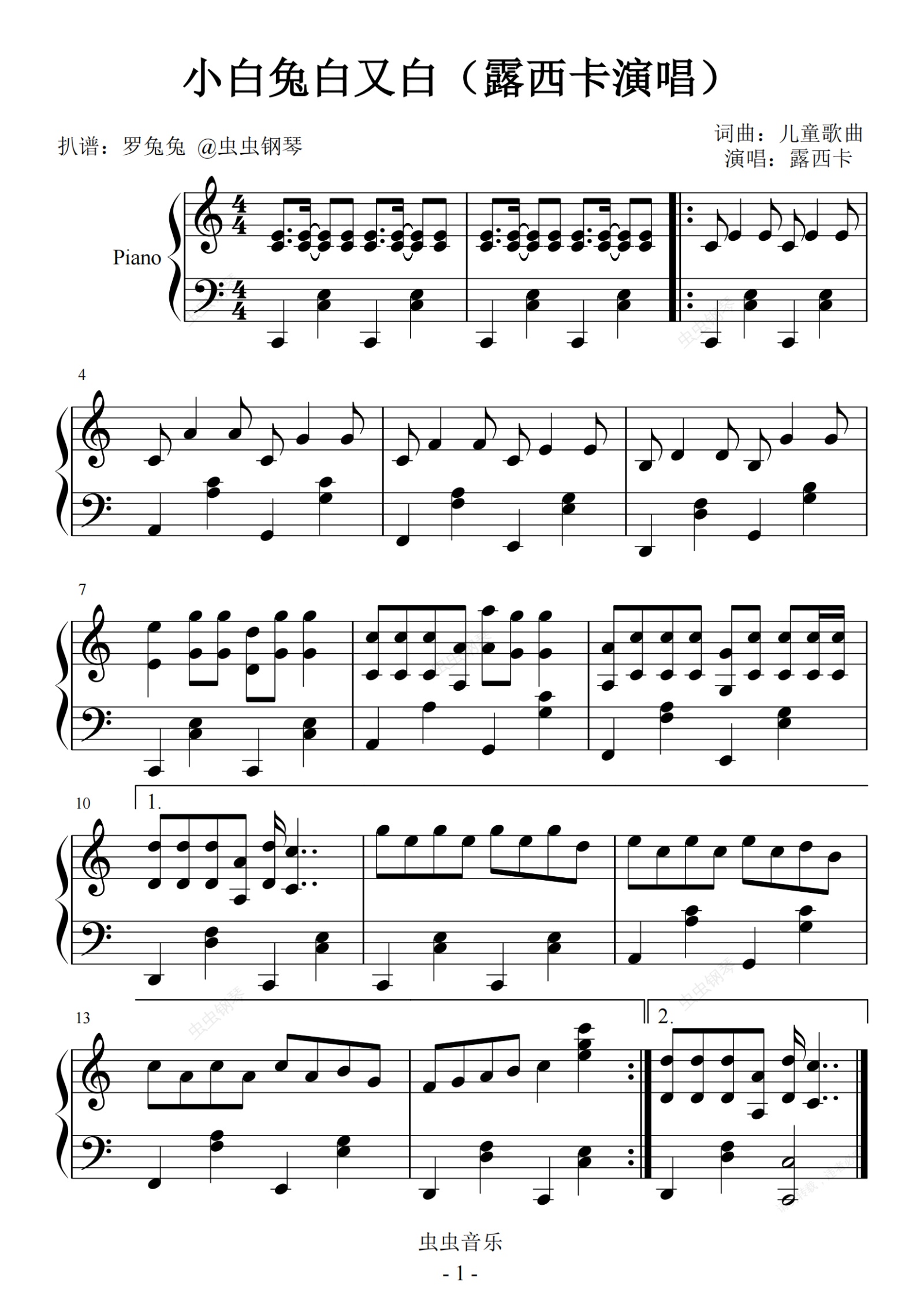 钢琴谱:小白兔白又白(露西卡演唱)