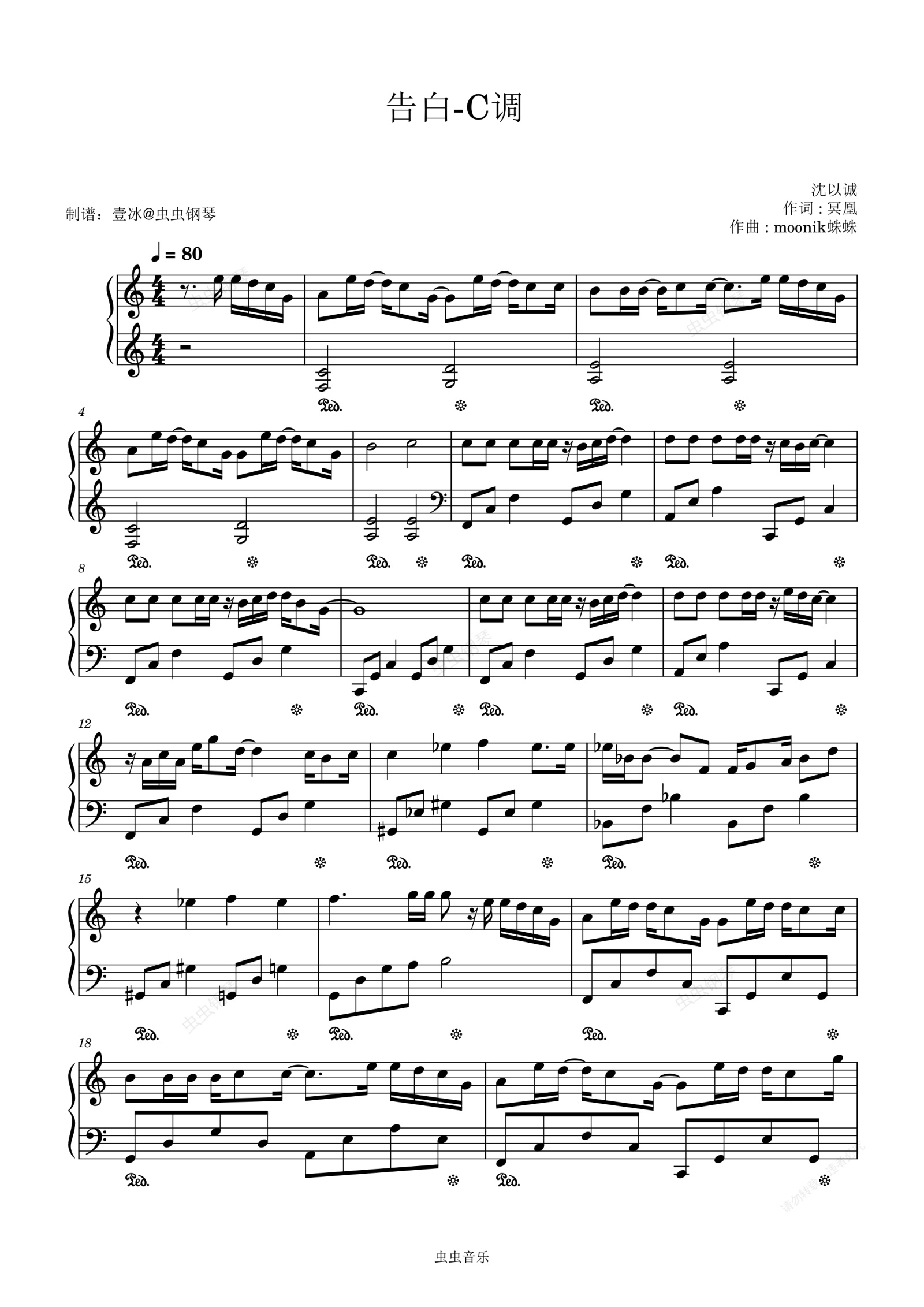 钢琴谱:告白//沈以诚 - C调 简单易上手