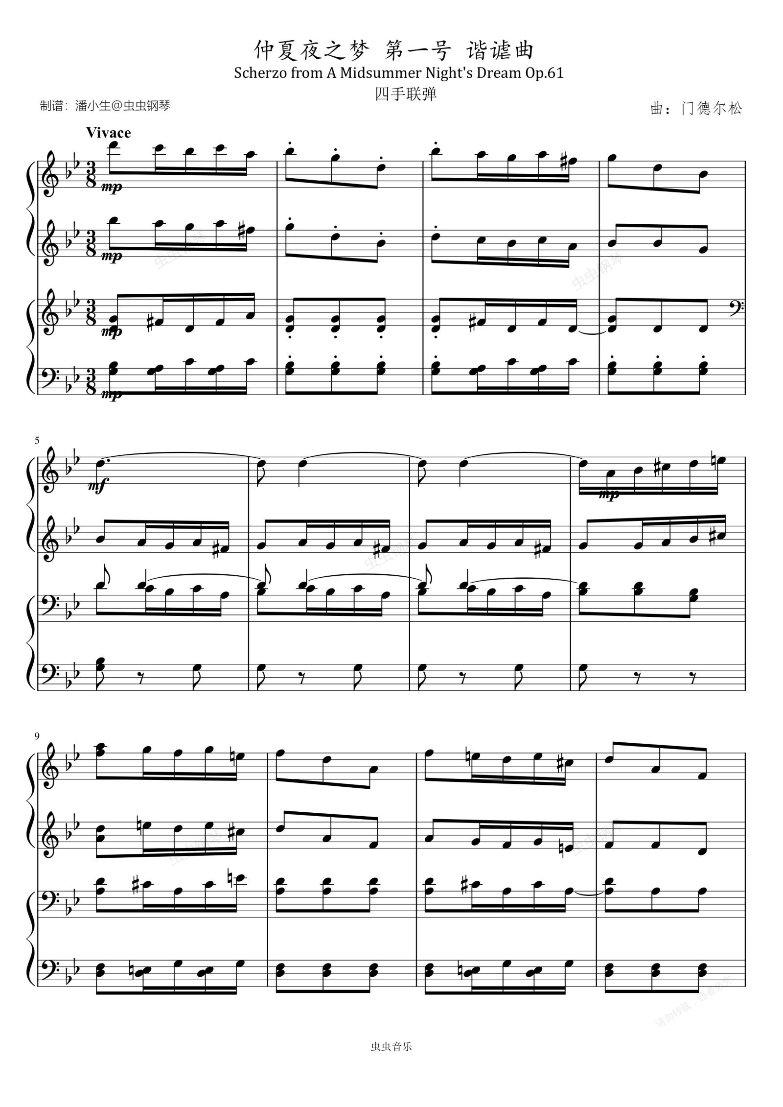 钢琴谱:门德尔松 仲夏夜之梦 第一号 谐谑曲 四手联弹 Op. 61 Scherzo from A Midsummer Night's Dream