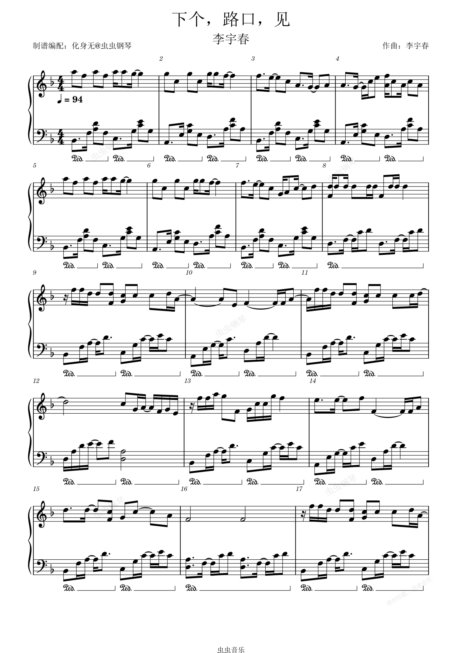 钢琴谱:下个路口见 化身无编配 原调独奏版