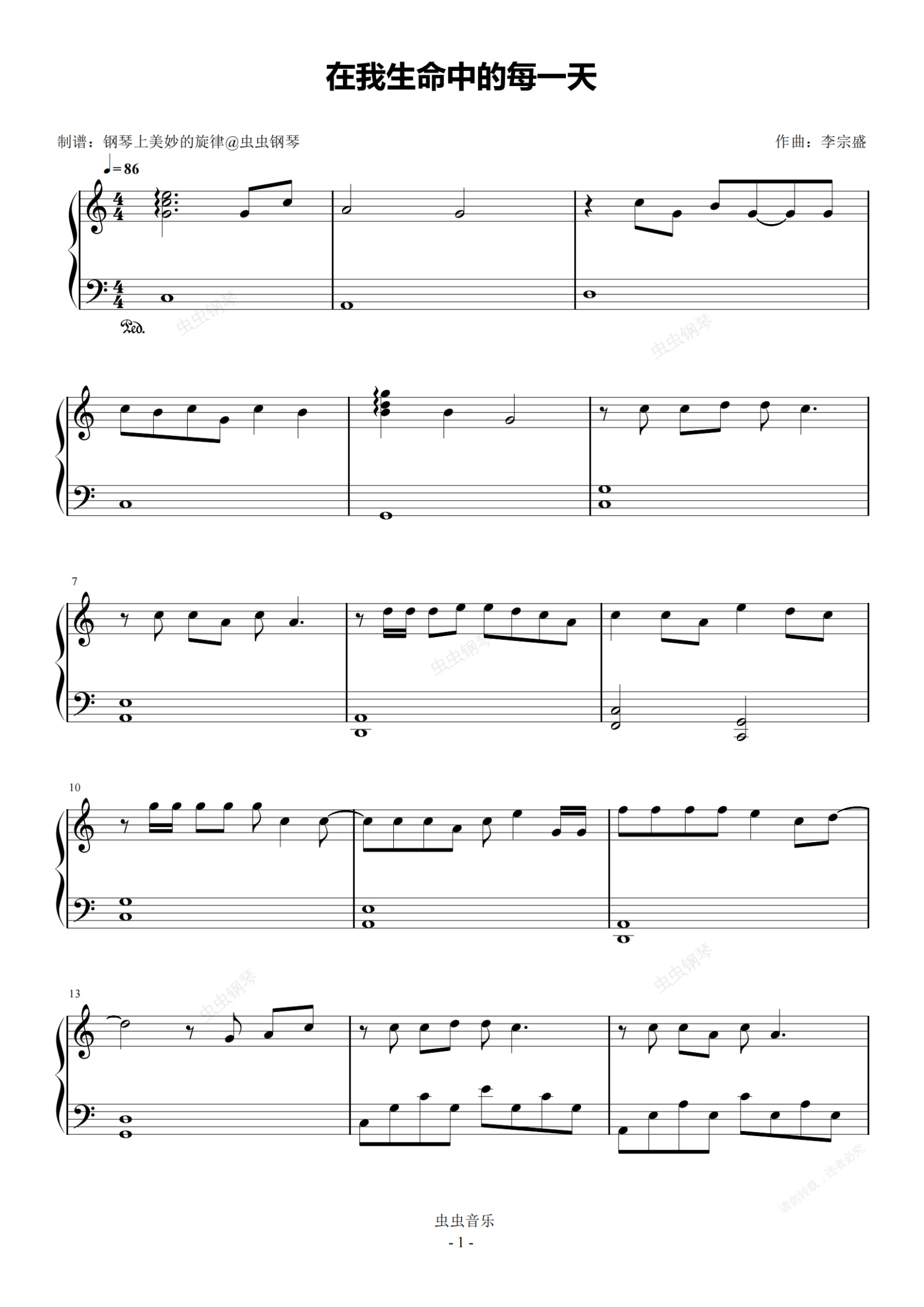 钢琴谱:在我生命中的每一天 C调简易版 成龙/苏慧伦 流行经典