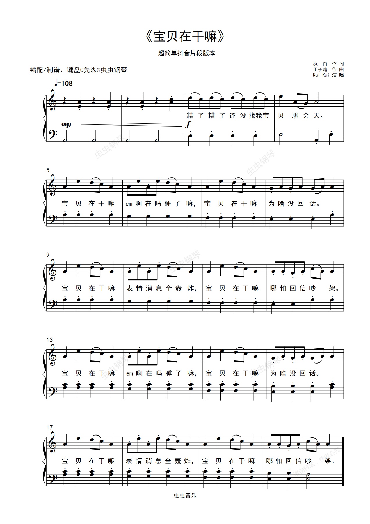 钢琴谱:宝贝在干嘛- 超简单抖音片段版本