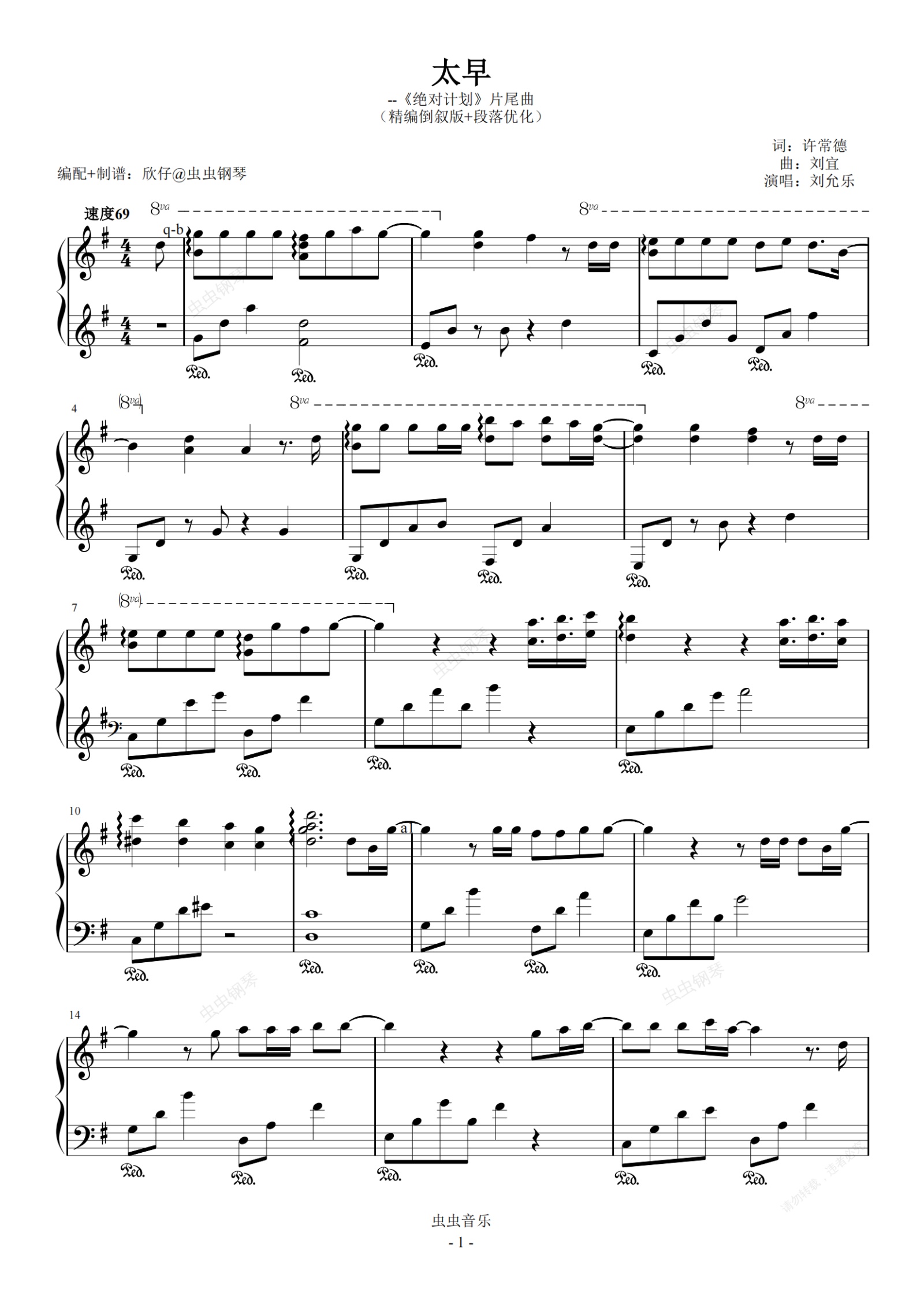 钢琴谱:刘允乐-G《太早》(《绝对计划》片尾曲、精编倒叙版+段落优化)