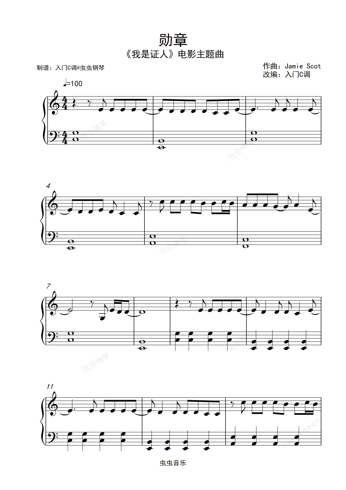钢琴谱:鹿晗《勋章》入门C调简单版