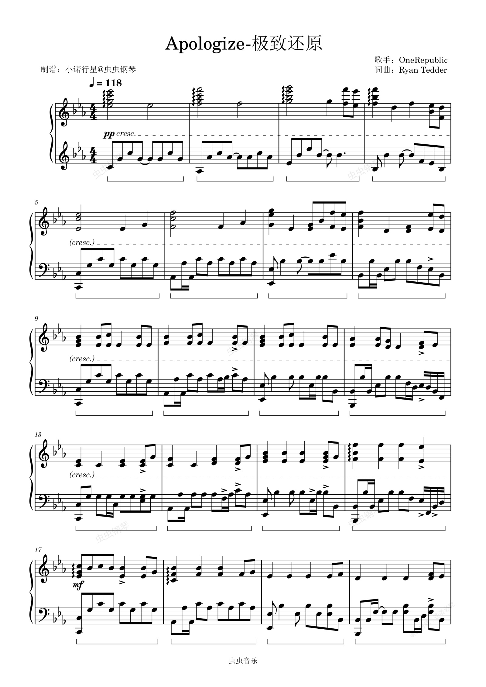 钢琴谱:Apologize-极致还原 钢琴独奏 (OneRepublic共和时代)