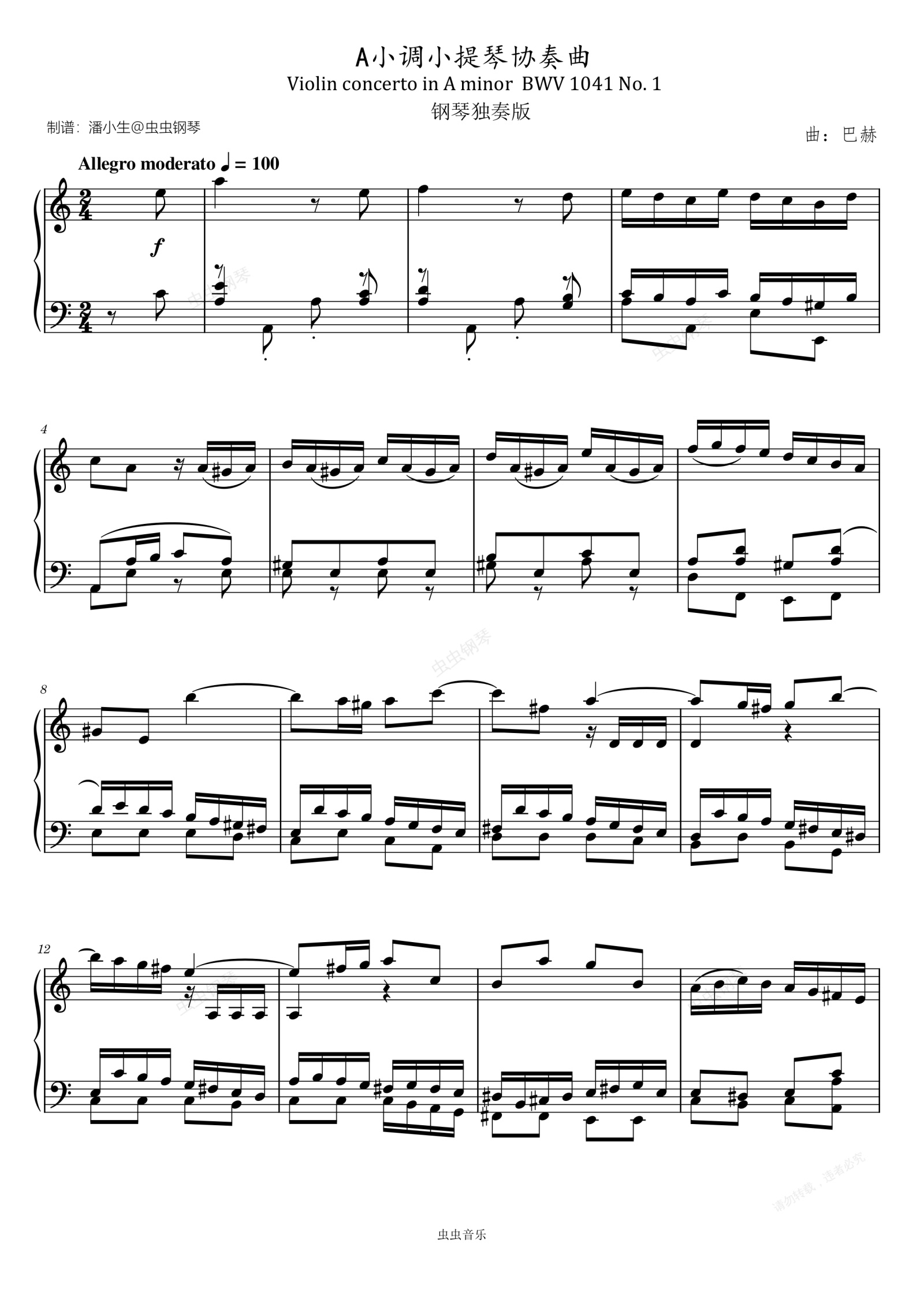 钢琴谱:巴赫 A小调小提琴协奏曲,BWV 1041 No.1 钢琴独奏版 Violin Concerto in A minor