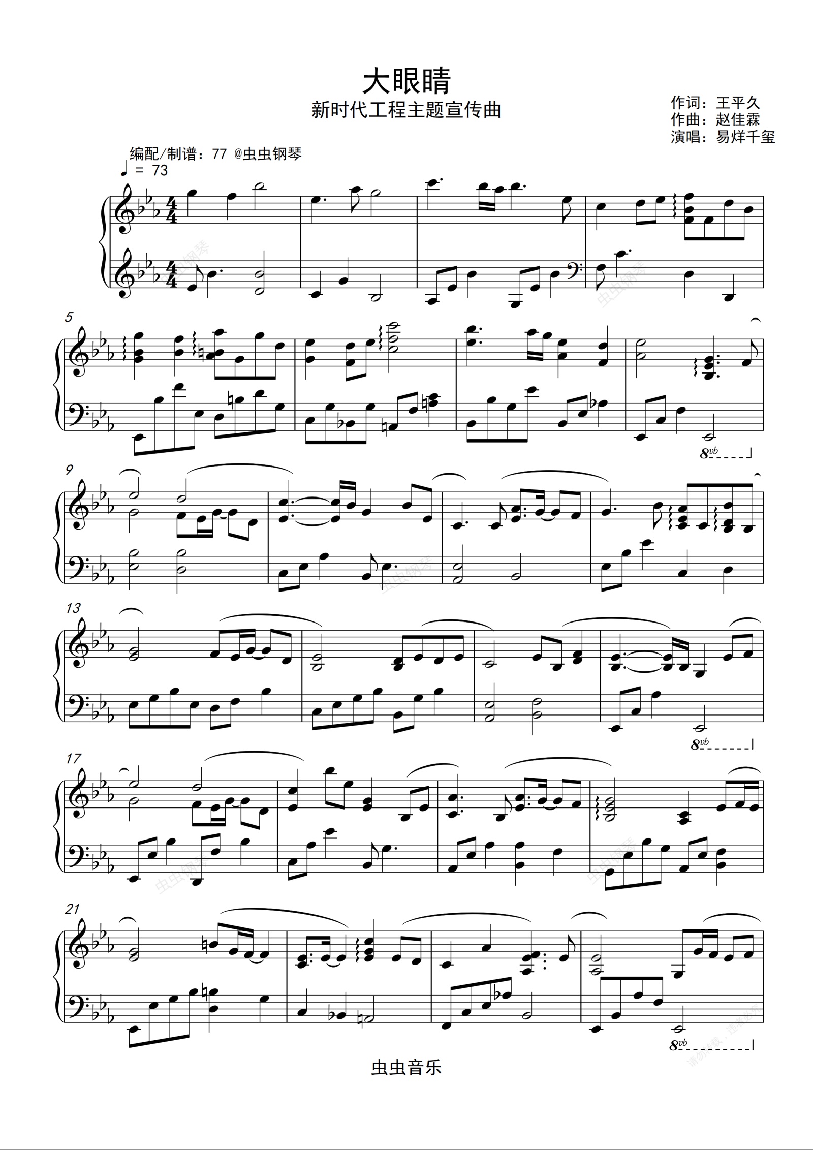 钢琴谱:易烊千玺 -《大眼睛》钢琴独奏谱